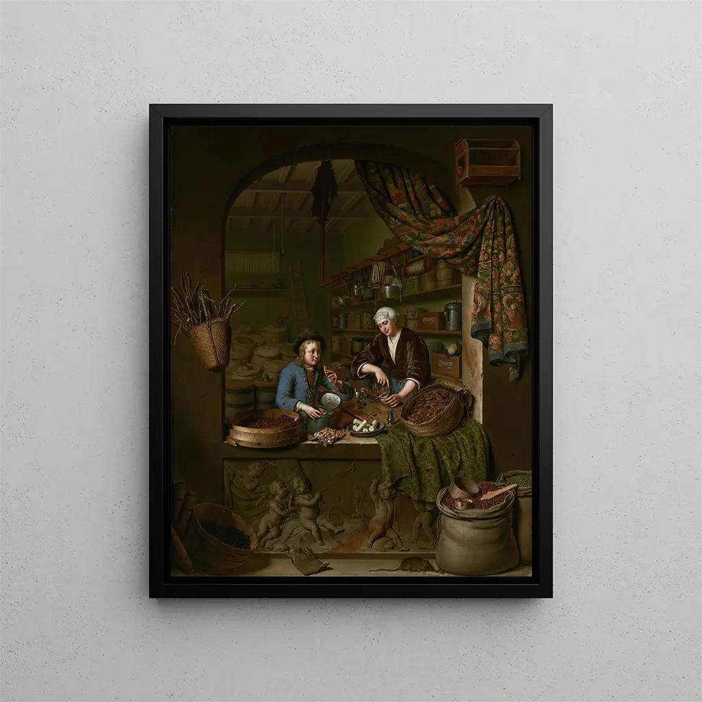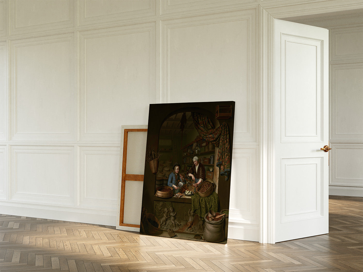 Immerse yourself in the intimate atmosphere of the 17th century with the art print of the painting A Grocery Store by Willem van Mieris. This work meticulously illustrates one of the most appreciated genres of the era: the Dutch genre scene, where everyday life is elevated through a richness of details and exceptional pictorial mastery.