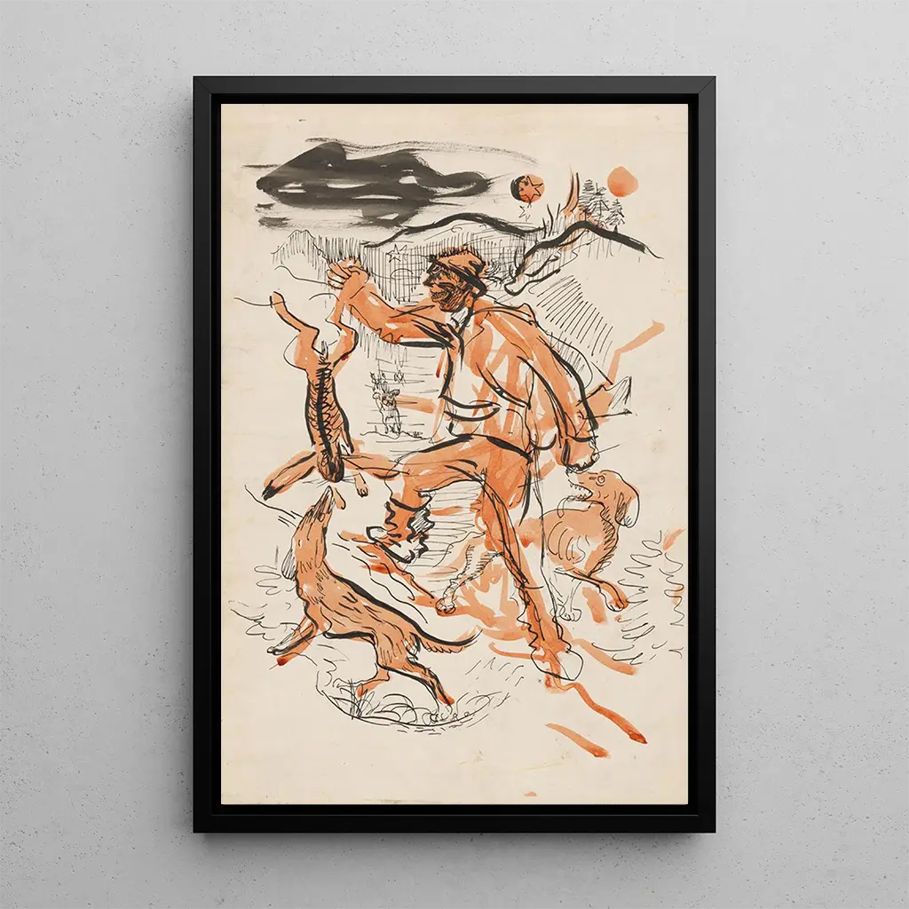 La reproduction de "Chasse nocturne" d'Arnold Peter Weisz-Kubínčan évoque une atmosphère mystérieuse, où les silhouettes des chasseurs se fondent dans un paysage nocturne. Les teintes sombres dominent, rehaussées par des éclats de lumière qui illuminent subtilement les détails des personnages et de la faune environnante. La technique de l'artiste, mêlant réalisme et impressionnisme, crée une dynamique captivante, invitant le spectateur à plonger dans cette scène nocturne. Chaque coup de pinceau semble raconter une histoire, où la nature et l'homme coexistent dans une harmonie troublante.