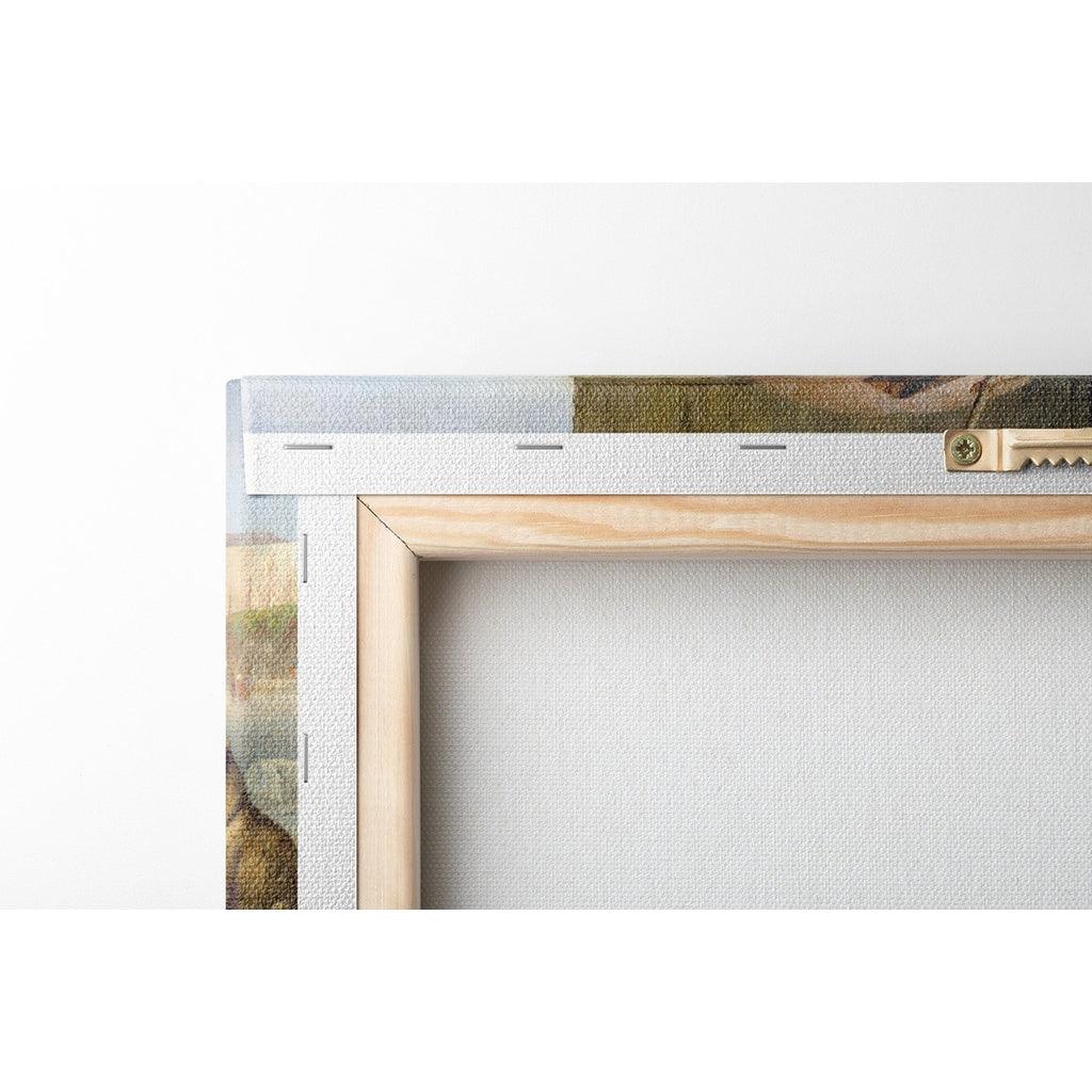 Canvas, matte finish print, mounted on a wooden structure, ready to hang. Framing options available on certain sizes.