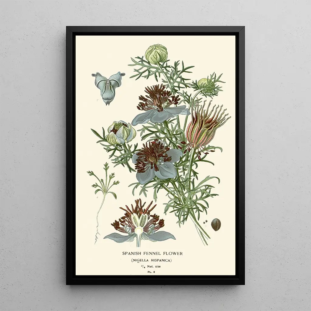 Nigelle d'Espagne : a floral poem in colors " Nigelle d'Espagne" is a captivating art print by Edward Step that evokes the delicacy and complexity of this flower. With its fine petals and shades of blue and white, this oil painting creates a serene and soothing atmosphere. The composition is carefully balanced, with each element placed precisely to highlight the beauty of the nigelle. The soft light illuminating the flower accentuates its details, making the work almost lifelike. Step succeeds in capturing the very essence of this plant, inviting the viewer to admire nature in all its splendor. Edward Step : a pioneer of British floral art Edward Step, a British painter and illustrator, made his mark with his floral art prints. Active during the late 19th century, he is part of an artistic movement that celebrates nature. Influenced by the Pre-Raphaelite movement, Step combined botanical accuracy with artistic sensitivity. He also authored several books on flowers, sharing his passion for botany with a wide audience. His unique approach to floral painting allowed him to stand out and leave a lasting legacy in the art world. A decorative piece with multiple virtues The art print "Nigelle d'Espagne" is a decorative item that will enhance any space. Whether in an office, a living room, or a bedroom, this poster adds a touch of freshness and poetry. Its printing quality ensures fidelity to the original work, allowing you to enjoy every detail. With its aesthetic appeal, this canvas becomes a focal point that draws the eye and inspires admiration. By incorporating this art print into your decor, you choose a piece that combines natural beauty and artistic elegance, enriching your daily environment.