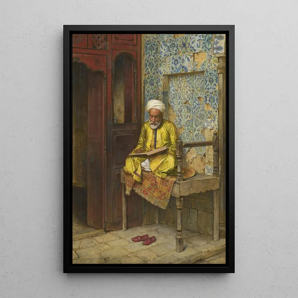 Arthur von Ferraris, a 19th-century painter, is known for his works exploring the themes of Orientalism. Influenced by his travels in Egypt and the Middle East, he draws inspiration from the landscapes, cultures, and local traditions. His style is characterized by a particular attention to detail and a rich color palette that captures the light and atmosphere of the places he depicts. "The learned man of Cairo" fits into a period when the West was increasingly interested in Eastern cultures, and Ferraris' work reflects this fascination, while offering a reflection on the importance of knowledge.