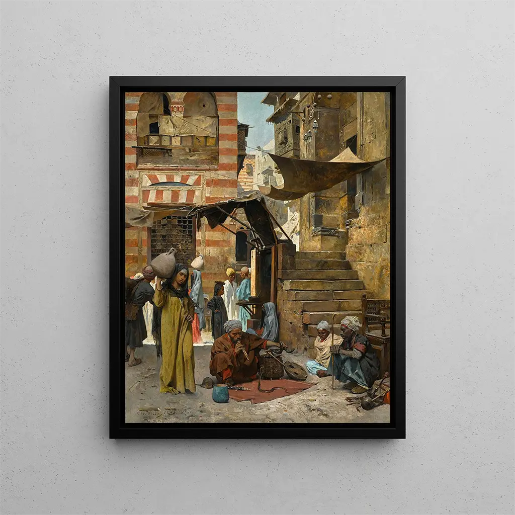 In the rich and intricate universe of Orientalist art, the artwork "A Souk in Cairo" by Charles Wilda emerges as a vibrant testament to daily life at the heart of the Arab world. This painting, depicting a lively souk, transports us to a place where colors, sounds, and scents intertwine to create a unique atmosphere. Through Wilda's perspective, the viewer is invited to explore narrow alleys and bustling stalls filled with merchandise, revealing the beauty and diversity of Egyptian culture. The piece does not merely depict a simple market; it evokes a sensory experience where every detail tells a story, and every face reflects an emotion.