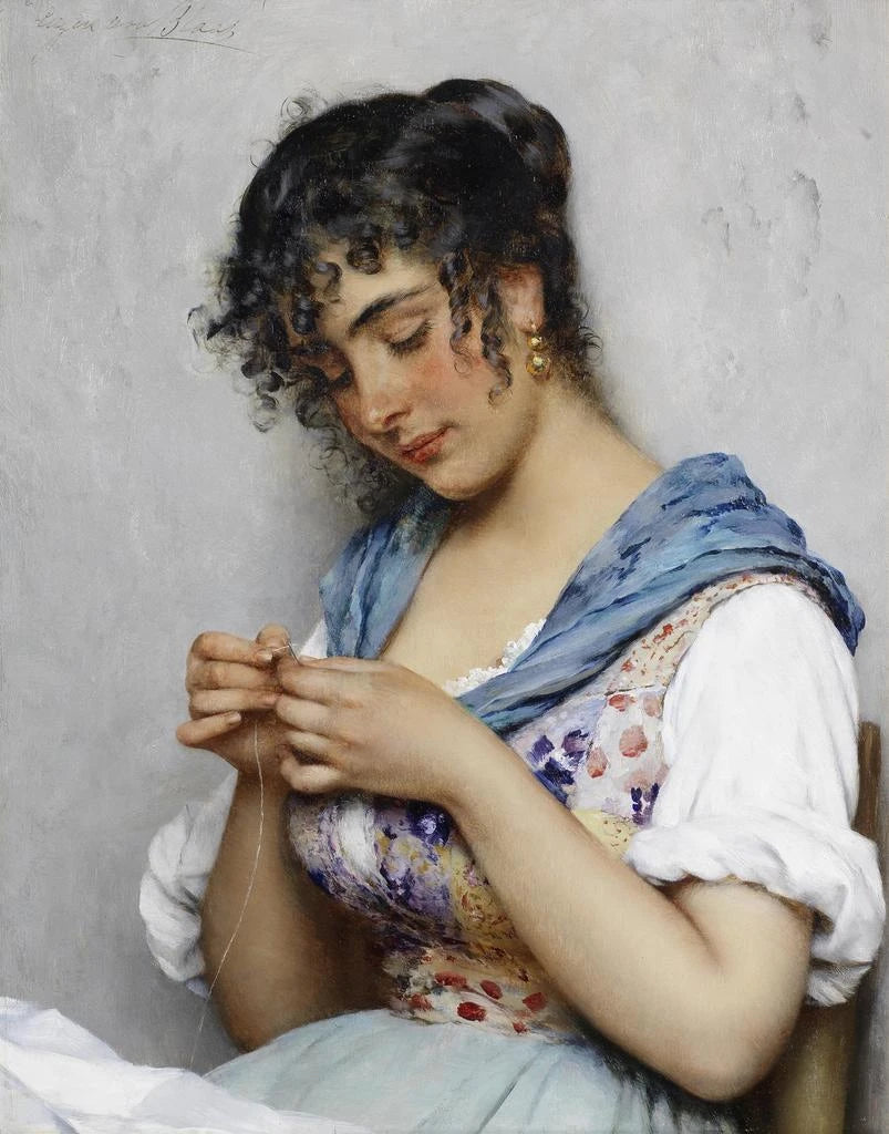 In the fascinating world of art, some works transcend the simple frame to become witnesses of an era, reflections of a culture. "The Italian seamstress" by Eugen von Blaas is one of those creations that, through its depth and delicacy, invites a sensory journey into the heart of 19th-century daily life. The piece depicts an intimate scene where the protagonist, dressed in an elegant dress, seems to capture the moment in an atmosphere of concentration and creativity. The soft light bathing the scene highlights the refined details and rich textures, making each brushstroke almost tangible. This art print thus offers an immersion into Blaas's artistic universe, while reminding us of the importance of craftsmanship and manual work in the society of his time. Style and uniqueness of the work Eugen von Blaas's style is often characterized by meticulous attention to detail and a vibrant color palette. In "The Italian seamstress," every element, from fabric to accessories, is treated with precision that reflects a deep respect for the subject. The artist excels in depicting textures, bringing fabrics to life under the seamstress's fingers. The composition of the piece, both simple and evocative, allows the viewer to immerse themselves in the intimacy of the workspace. The nuances of light and shadow create a warm, almost palpable atmosphere, while the seamstress's focused and serene gaze draws the eye and invites contemplation. This work is not just a visual representation; it also evokes emotions and memories, reminding everyone of the importance of everyday gestures. The artist and his influence Eugen von Blaas, born in 1843 in Venice, is a prominent representative of the academic movement and a master of genre painting. His artistic training led him to explore various subjects, but it is often daily life and women of his time that inspire him the most. The influence of Italian culture is omnipresent in his work, and "The Italian seamstress" is a perfect example. Blaas has managed to capture not only