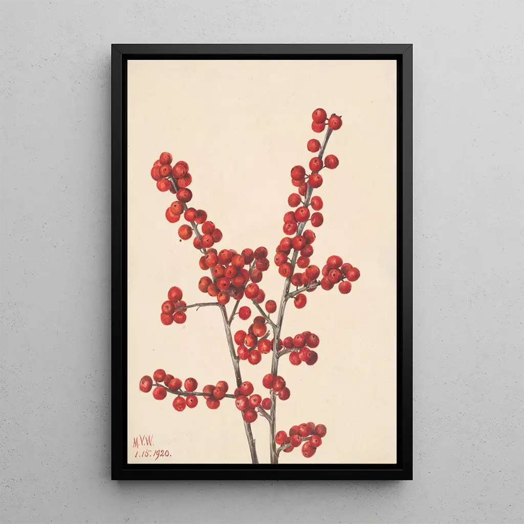 Ilex verticillata art print: an ode to wild nature In this art print of the Ilex verticillata painting, Mary Vaux Walcott captures the very essence of North American flora. The vibrant colors of green and red blend harmoniously, evoking the freshness of winter forests. The delicate watercolor technique allows for remarkable detail in the leaves and berries, creating an atmosphere that is both lively and soothing. Each brushstroke seems to breathe new life into this plant, inviting the viewer to a careful contemplation of natural beauty. Mary Vaux Walcott: a pioneer of botanical art Mary Vaux Walcott, active in the early 20th century, is recognized for her commitment to faithfully representing American flora. Influenced by the naturalist movement, she skillfully combined art and science, making her works references for botanists and art enthusiasts alike. Her passion for nature led her to explore various ecosystems, documenting the biodiversity of her time. Walcott was also a passionate advocate for plant conservation, which grants her an important place in the history of art and ecology. A decorative acquisition with multiple assets The reproduction of the Ilex verticillata painting is an ideal decorative piece for various spaces such as the living room, office, or bedroom. Its print quality and fidelity to the original colors make it an attractive choice for those wishing to bring a touch of nature into their interior. With its aesthetic appeal, this canvas is not only a decorative element but also an invitation to appreciate the beauty of the natural world. By incorporating this artwork into your decor, you give your space a warm and inspiring atmosphere.