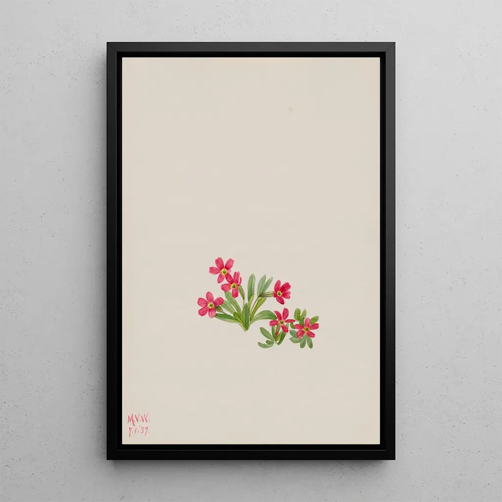The art print of Primevère Primula angustifolia immerses us in a world of softness and lightness. The delicate petals, with pastel shades, evoke the freshness of spring mornings. Every detail is carefully rendered, from the veins of the leaves to the subtle nuances of the flowers. The watercolor technique, used by Mary Vaux Walcott, gives this piece an almost ethereal atmosphere, as if the flowers were ready to take flight with the breeze. This canvas invites contemplation, discovery of nature's wonders, while celebrating the fleeting beauty of flowers.