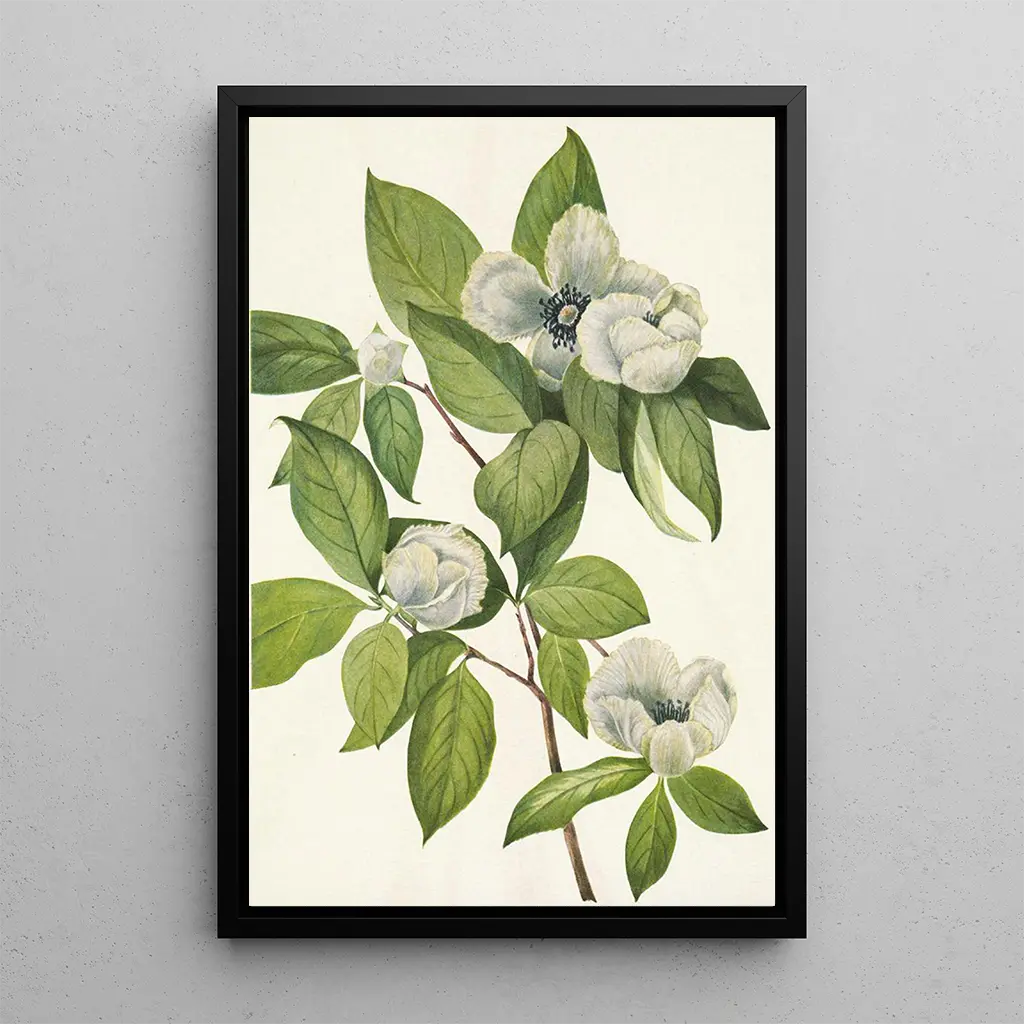 Virginie Stewartia: A Visual Poem of Nature The art print of Virginie Stewartia immerses us in a delicate floral universe, where each petal seems to whisper the secrets of nature. The shades of green and white intertwine harmoniously, creating a soothing and contemplative atmosphere. The watercolor technique, used by Mary Vaux Walcott, captures the lightness and transparency of the flowers, while adding a subtle depth to the overall composition. This artwork invites a meticulous exploration of details, revealing the ephemeral beauty of American flora. Mary Vaux Walcott: A Pioneer of Botanical Art Mary Vaux Walcott, active in the early 20th century, is renowned for her unique approach to botanical art. Influenced by naturalist movements and scientific discoveries of her time, she mastered combining precision and aesthetics in her works. Her illustrations, including the Virginie Stewartia, demonstrate a deep respect for nature and a desire to raise public awareness about biodiversity. As a member of the American Botanical Society, Walcott played a key role in documenting plant species, leaving a lasting artistic and scientific legacy. A Decorative Acquisition with Multiple Assets Choosing a reproduction of Virginie Stewartia means selecting a canvas that will enhance any space, whether a living room, office, or bedroom. The quality of the print ensures faithful reproduction of the colors and details of the original artwork, bringing a touch of freshness and serenity to your interior decor. Its aesthetic appeal, combined with its message of environmental preservation, makes it an ideal choice for those wishing to combine art and ecological commitment. This art print is much more than a simple painting; it is an invitation to marvel at the beauty of the natural world.