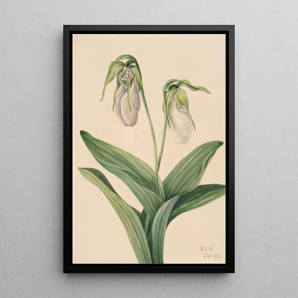 The artwork "Sabot de la Vierge pâle Cypripedium acaule" by Mary Vaux Walcott immerses us in a strikingly beautiful floral universe. This piece highlights the delicacy of the flower, with its petals of creamy white and shades of green that evoke the freshness of the undergrowth. The watercolor technique used by the artist captures the transparency and lightness of the plant, creating a soft and soothing atmosphere. Every detail is carefully rendered, from the veins of the leaves to the subtle play of light, inviting the viewer to a mindful and respectful contemplation of nature.