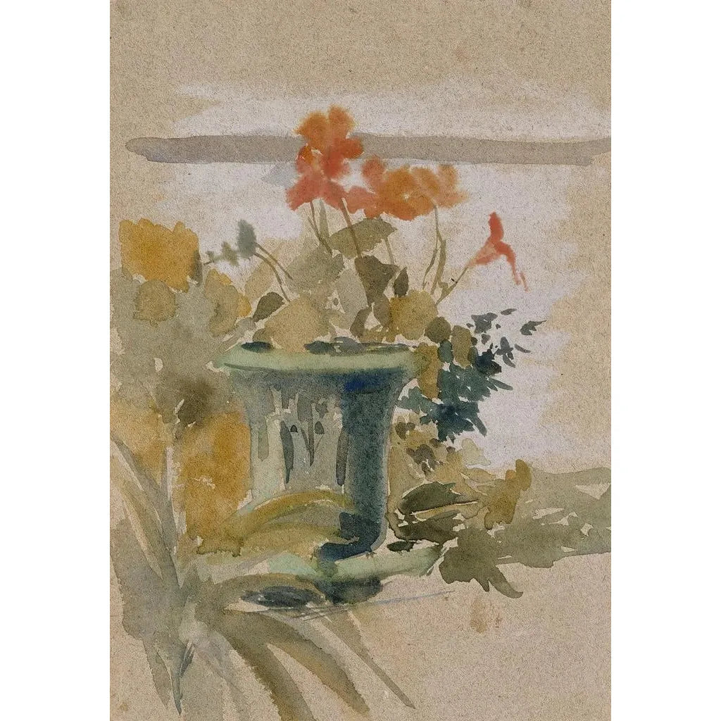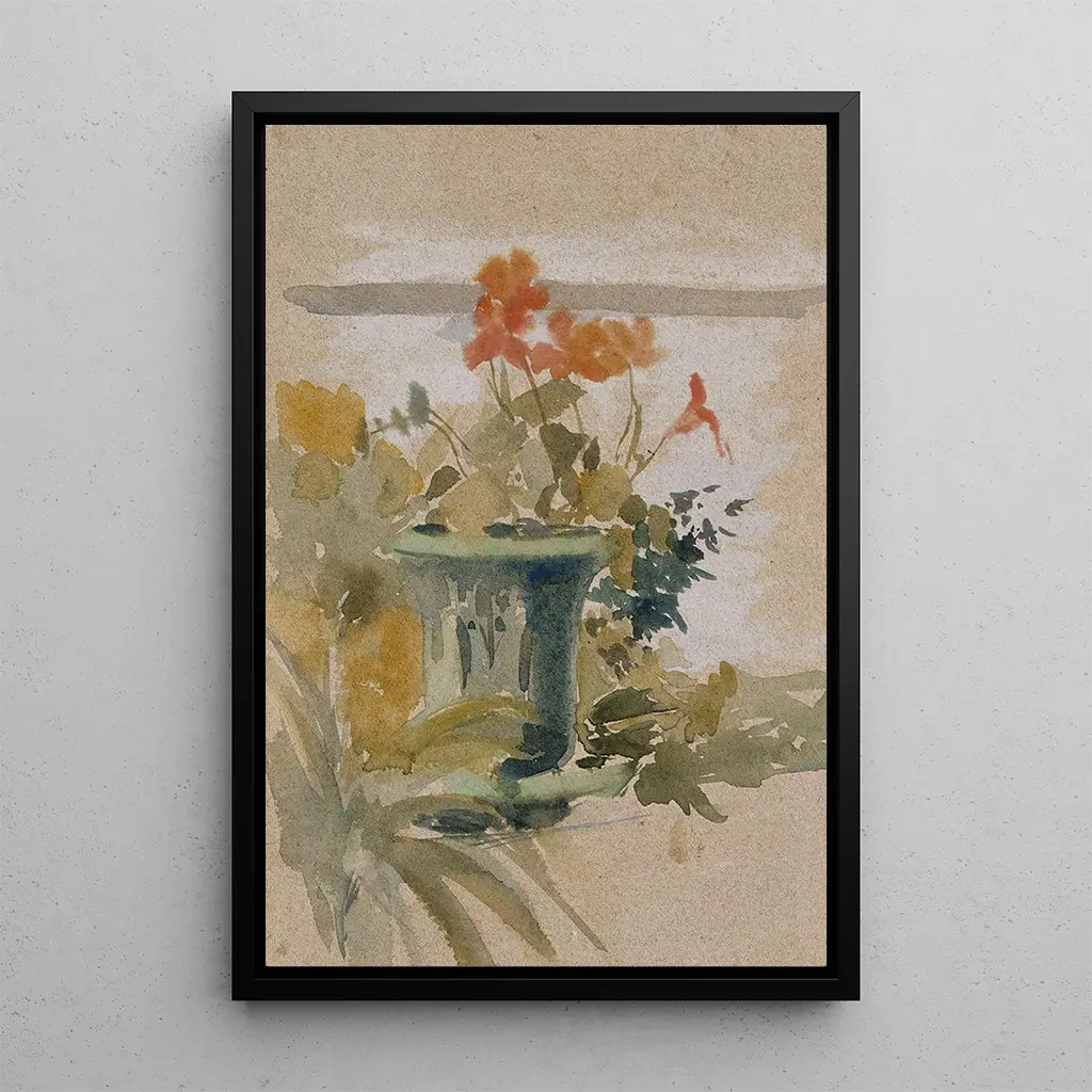 The art print "Pélargoniums on the Terrace" by Albert Edelfelt evokes a lush garden where flowers vibrate with life. The pélargoniums, with their vibrant shades of red and pink, are highlighted by a luminous background that suggests the warmth of a sunny afternoon. The harmonious composition and skillful use of light create a joyful and lively atmosphere, inviting the viewer to immerse themselves in this floral painting. Edelfelt's impressionist technique, which plays on brushstrokes and color nuances, gives a sense of movement and lightness to the whole.
