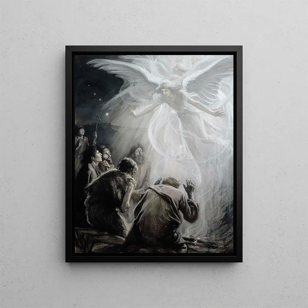 The art print "Revelation of the angels to the shepherds" by Albert Edelfelt is an iconic piece that transports viewers into a mystical and luminous universe. Painted at the end of the 19th century, this work depicts a key moment in Christian tradition, where angels appear to the shepherds to announce the birth of Christ. Edelfelt, with his mastery of light and color, manages to capture the wonder and faith of the characters, while offering a poetic and emotional vision of the scene. The delicacy of the faces and the richness of details make this piece a true invitation to contemplation. Style and uniqueness of the work Albert Edelfelt's style is characterized by a harmonious fusion of realism and impressionism, two currents that influence his artistic approach. In "Revelation of the angels to the shepherds," he uses a palette of warm and vibrant colors, creating a striking contrast between the celestial light of the angels and the ambient darkness of the night. The figures of the shepherds, rendered with great expressiveness, testify to the depth of human emotions in the face of the unknown. The composition is skillfully orchestrated, guiding the viewer's gaze toward the center of the scene, where this divine revelation unfolds. Edelfelt plays with light, making it almost tangible, which lends the work an almost sacred dimension. The artist and his influence Albert Edelfelt, a Finnish artist, is recognized for his major role in the history of Nordic art. His training in France, under the influence of impressionist masters, allowed him to refine his style and incorporate innovative elements into his works. The depiction of light and human emotions is at the heart of his work. Edelfelt transcended national borders to become an ambassador of Finnish art internationally. His influence is still felt today, both through his pictorial techniques and his narrative approach. By choosing to depict spiritual and historical themes, he paved the way for many contemporary artists, who draw inspiration from his ability to marry technique and emotion. An exceptional wall decoration signed by Artem Legrand The art print of "Revelation of the angels to the shepherds" by Albert Edelfelt is more than a simple decorative element; it embodies a true aesthetic experience. Signed by Artem Legrand, this piece is intended for those who wish to enrich their interior with a touch of elegance and culture. This painting, through its spiritual theme and refined execution, can transform a space into a place of serenity and contemplation. Hung in a living room, bedroom, or office, it invites reflection and escape. The timeless beauty