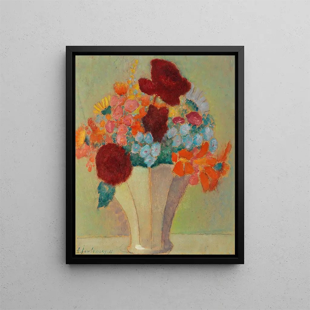 Jawlensky's style is characterized by a bold approach to color and form. In "Luminosity Bouquet Still Life Art print," he uses vibrant shades, ranging from bright yellows to deep reds, to create a striking contrast that draws the eye. The contours of the flowers are both fluid and defined, demonstrating technical mastery that gives the work a unique dynamism. This piece does not merely depict a bouquet; it reveals its soul, capturing light in a way that evokes a feeling of warmth and joy. The composition is carefully balanced, with each element having its place, while also revealing a certain spontaneity. In doing so, Jawlensky reminds us that nature, in all its beauty, is both orderly and chaotic.