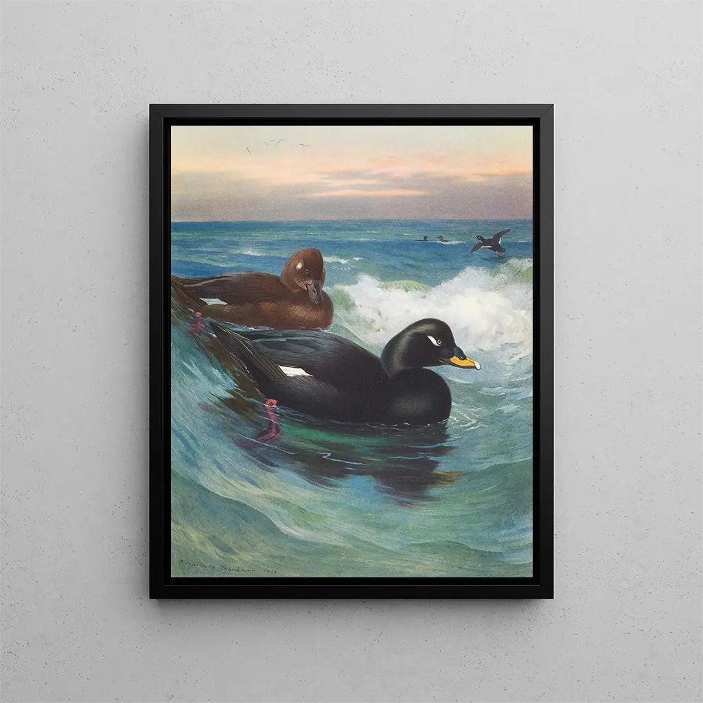Macreuse à velours art print - Archibald Thorburn – Captivating Introduction In the delicate world of wildlife art, "Macreuse à velours" by Archibald Thorburn stands out for its elegance and precision. This piece, which captures the wild beauty of nature, invites viewers to immerse themselves in a universe where fauna is celebrated with remarkable meticulousness. Thorburn, a master of drawing and color, manages to breathe vibrant life into his subjects, transforming each artwork into an open window to the natural world. The depiction of the macreuse, with its rich plumage and striking details, evokes a sense of serenity and harmony, reminding everyone of the importance of preserving our environment. Style and uniqueness of the work Archibald Thorburn's style is characterized by meticulous attention to detail and a color palette that reflects the beauty of British landscapes. In "Macreuse à velours," each feather is rendered with precision that demonstrates the artist's careful observation. The shades of brown, black, and white blend harmoniously, creating a contrast that highlights the grace of the bird. The composition is carefully balanced, allowing the macreuse to flourish within its environment while attracting the viewer's gaze. Thorburn does not merely depict a bird; he captures its essence, movement, and habitat, offering an immersive experience that transports the viewer to the heart of the wild. The artist and his influence Archibald Thorburn, born in 1860, is considered one of the greatest wildlife artists of his time. His passion for nature and his commitment to species conservation are reflected in his work. Thorburn succeeded in establishing himself through his unique style that combines realism and artistic sensitivity. Drawing inspiration from Scottish landscapes and the animals that inhabit them, he created works that transcend simple animal portraits. His influence is palpable in the art world, where many contemporary artists refer to his work for inspiration. Thorburn's ability to marry art and nature continues to inspire future generations, reminding everyone of the importance of celebrating and