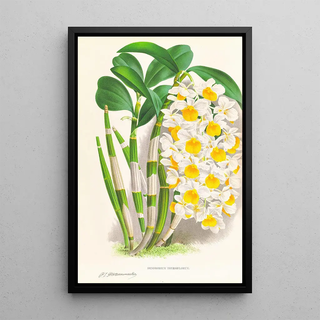 The reproduction of the Dendrobium thyrsiflorum painting is an ideal decorative piece to enhance your interior. Whether in a living room, office, or bedroom, this canvas adds a touch of freshness and color. Its printing quality guarantees fidelity to the details of the original work, allowing you to fully enjoy its aesthetic appeal. By choosing this art print, you opt for a decoration that evokes the beauty of nature while adding a note of elegance to your living space.