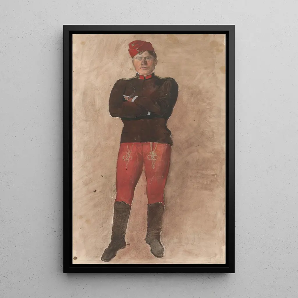 The art print of Soldier standing, arms crossed is a decorative piece that harmoniously fits into various spaces, whether a living room, office, or bedroom. Its print quality and fidelity to the details of the original work make it an ideal choice for those wishing to enrich their interior with an artistic touch. This art print draws the eye and sparks conversations, thanks to its aesthetic appeal and the depth of its message. By choosing this canvas, you give your space a cultural and historical dimension, while celebrating the talent of Ladislav Mednyánszky.