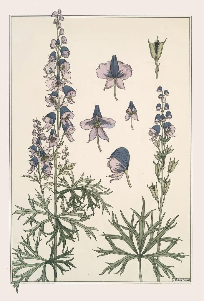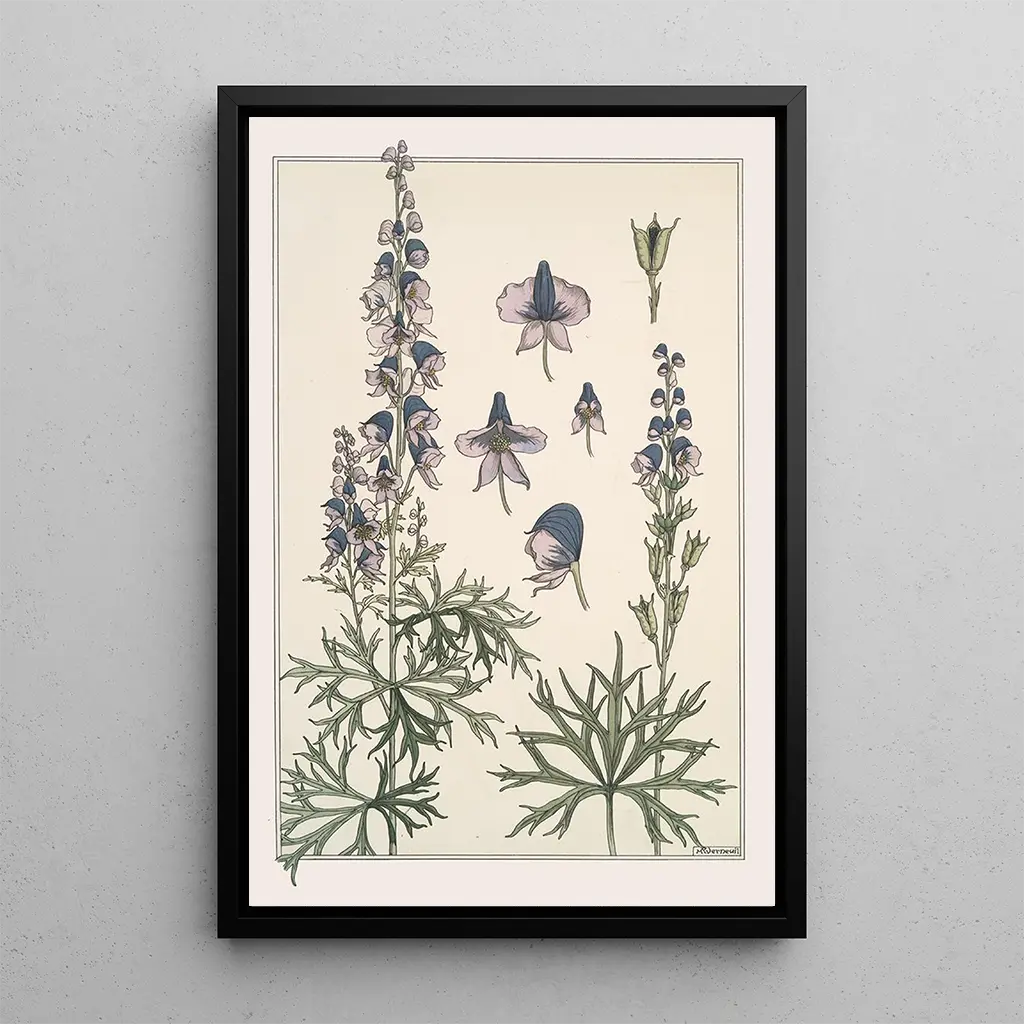 The art print Aconit by Maurice Pillard Verneuil is a true ode to nature, where the aconit flowers unfold with rare elegance. The shades of violet, blue, and green intertwine to create a vibrant composition that captures the eye and the imagination. The artist's technique, blending watercolor and drawing, gives each detail an airy lightness while highlighting the complexity of organic forms. This art print evokes a dreamlike atmosphere, where the beauty of the flowers mingles with subtle melancholy, recalling the duality of nature.