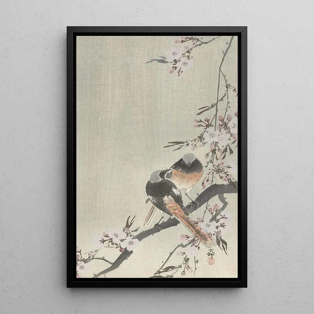 In this artwork, Ohara Koson captures the ephemeral beauty of birds and flowers. The two red-crowned cranes, gently resting among fully bloomed cherry blossoms, create a peaceful and contemplative atmosphere. The pastel colors, blending shades of pink and green, evoke the softness of spring. The Japanese woodblock print technique, with its meticulous details and sharp outlines, allows you to feel the lightness of the plumages and the fragility of the petals. This art print invites a contemplative pause, a moment of connection with nature.