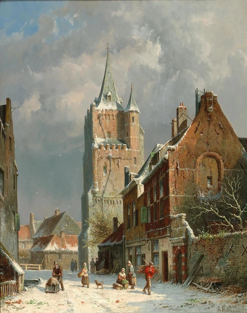 Adrianus Eversen, Dutch painter of the 19th century, is often recognized for his ability to capture daily life with touching authenticity. Influenced by the masters of the past, he developed a style that is uniquely his own, combining realism and impressionism. Eversen was a keen observer of the society of his time, and his works testify to a deep understanding of human dynamics and urban landscapes. His artistic legacy is reflected in how he immortalized scenes of everyday life, thus influencing many contemporary and future artists. His ability to pay homage to the beauty of simple moments makes him an essential figure in Dutch art.