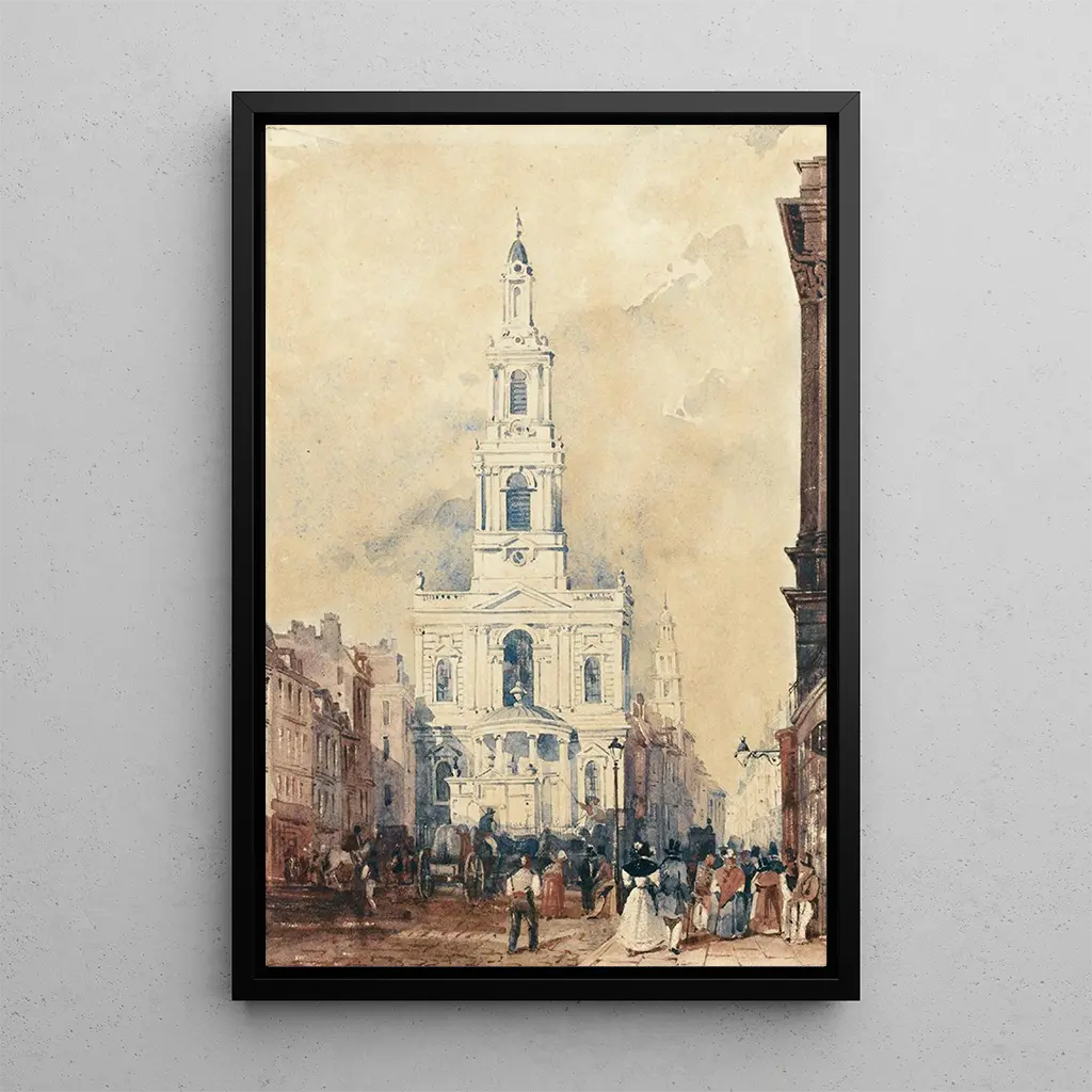 The art print "Vue de l'église Sainte-Marie à Londres" by William Wyld offers an enchanting perspective on London architecture. This painting depicts the church with remarkable accuracy, surrounded by the vibrancy of urban life. The soft tones and interplay of shadow and light create a warm atmosphere, inviting viewers to explore the details of this lively scene. Wyld's technique, blending realism and romanticism, allows one to feel the soul of London through this artwork, making each glance a new discovery.