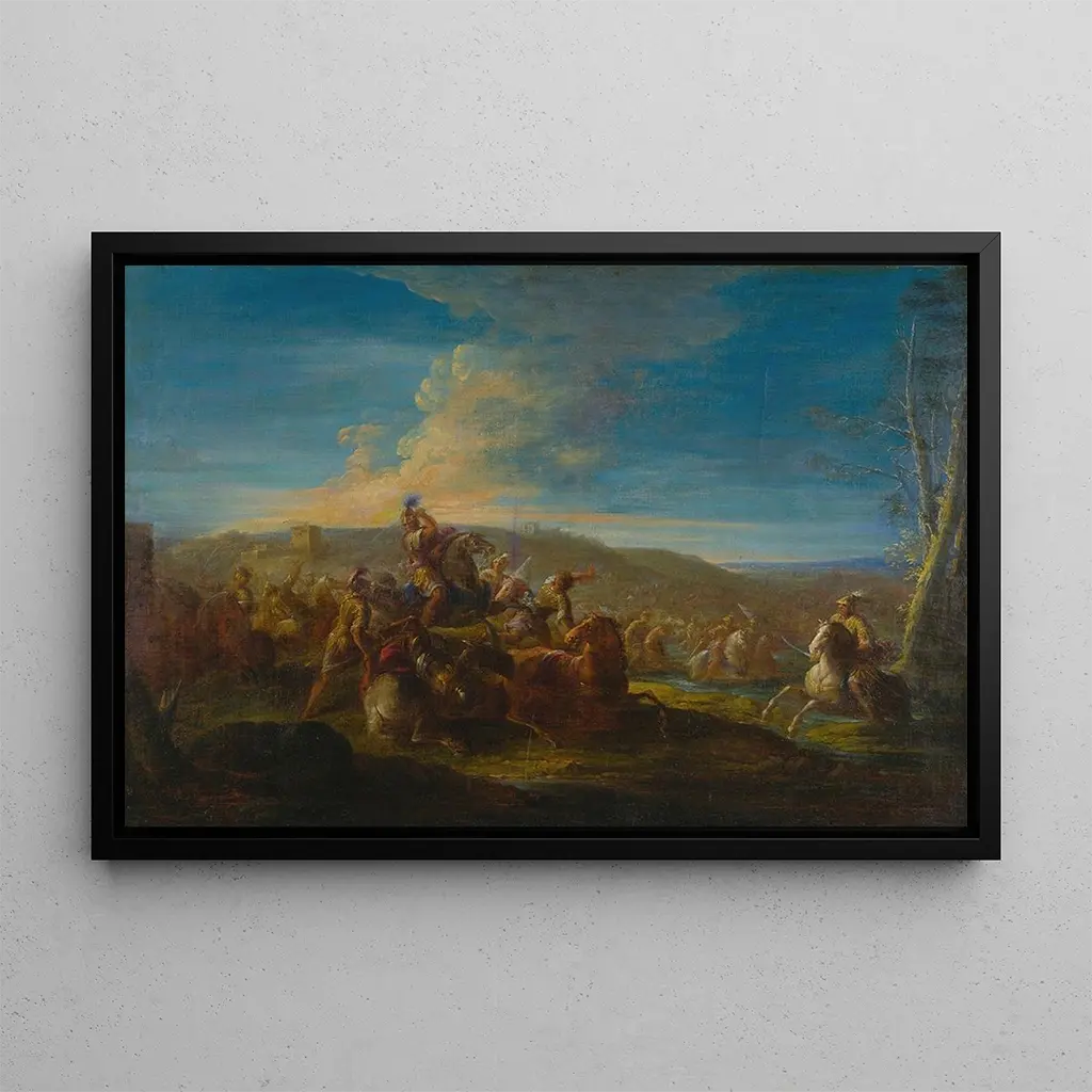 A battle scene: a vibrant painting full of dynamism and tension The art print of "A battle scene" immerses us in the heart of a tumultuous confrontation, where vivid colors and energetic brushstrokes evoke an atmosphere of chaos and bravery. The human figures, frozen in dramatic postures, seem to clash in a whirlwind of movement. Shades of red and black dominate the canvas, emphasizing the scene's intensity. The technique used, likely oil, allows for depth and a richness of textures that captivate the eye. This artwork, through its expressiveness, invites reflection on human nature in the face of war. School of Giuseppe Zais: a reflection of Italian baroque art The School of Giuseppe Zais, active in the 18th century, is representative of a baroque style that blends realism and dramatization. Zais, influenced by the masters of his time, was able to capture historical scenes with great precision. Although less known than his contemporaries, he contributed to the evolution of military painting in Italy, highlighting dynamic compositions and meticulous details. His work bears witness to a period when art served to glorify military events while offering a subtle critique of human conflicts. A decorative acquisition with multiple assets Choosing the art print of "A battle scene" is a bold choice to enhance your interior decor. Whether in a living room, office, or bedroom, this artwork inevitably draws the eye and sparks conversations. Its reproduction quality guarantees fidelity to the original details, while adding a touch of history and emotion to your space. With its undeniable aesthetic appeal, this canvas becomes a central element of your decoration, combining culture and style.