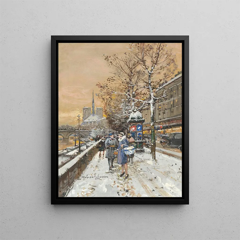 In the vibrant world of impressionist art, "A Rendez-vous on the Banks of the Seine" by Eugène Galien-Laloue stands out for its ability to capture the essence of a fleeting moment. This artwork, imbued with light and movement, evokes a Parisian scene where the river and its banks become the stage for human interactions. Through this art print, the artist invites us to immerse ourselves in a lively atmosphere where time seems to stand still. The Seine, a living artery of the capital, transforms into a mirror of the society of its time, revealing both the beauty of the landscapes and the richness of human exchanges.