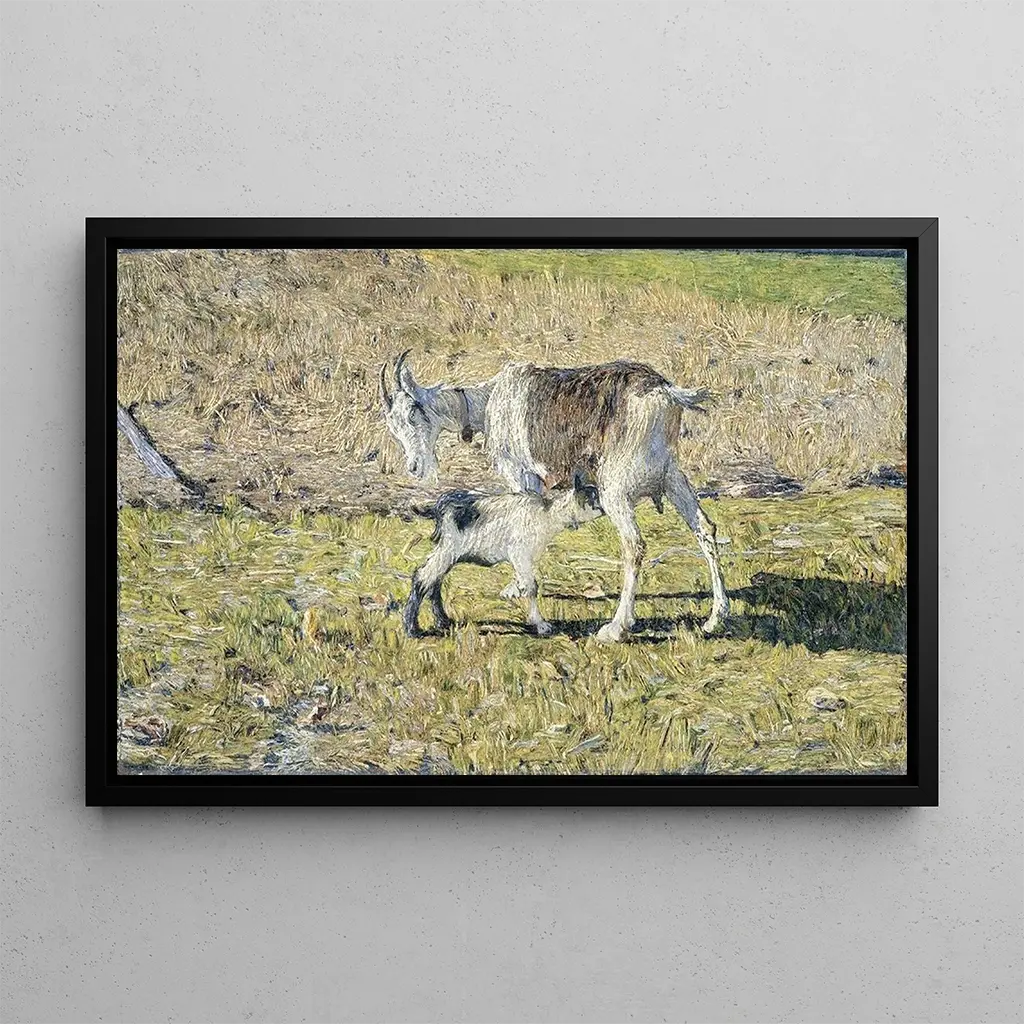 The canvas "A goat with its kid" by Giovanni Segantini evokes a scene filled with softness and serenity. The gentle colors, blending shades of green and brown, immerse the viewer in a pastoral landscape where nature and animals coexist harmoniously. Segantini's technique, characterized by delicate pointillism, captures the light and texture of the goat's and its young's fur. The atmosphere emanating from this artwork is both calming and joyful, inviting silent contemplation of the simple beauty of rural life.