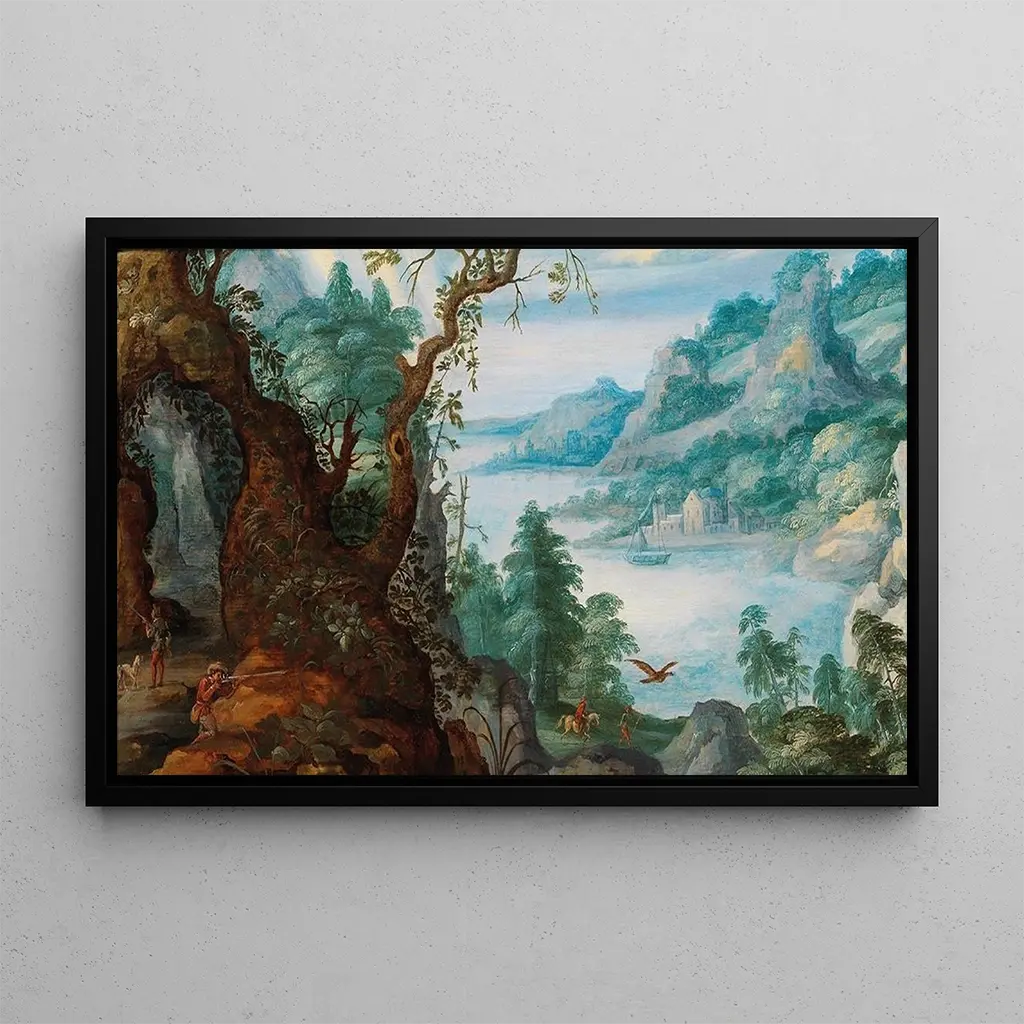 In this art print of A Mountain Landscape with Hunters, Marten Ryckaert transports us to the heart of a wild and majestic nature. The canvas depicts a mountainous landscape where hunters, dressed in period costumes, move through a richly detailed environment. Shades of green and brown dominate, evoking the freshness of forests and the sturdiness of mountains. The soft light filtering through the trees creates a peaceful, almost contemplative atmosphere, inviting the viewer to immerse themselves in the beauty of this painting. Every element, from the hunters to the animals, seems perfectly integrated into this lively tableau.