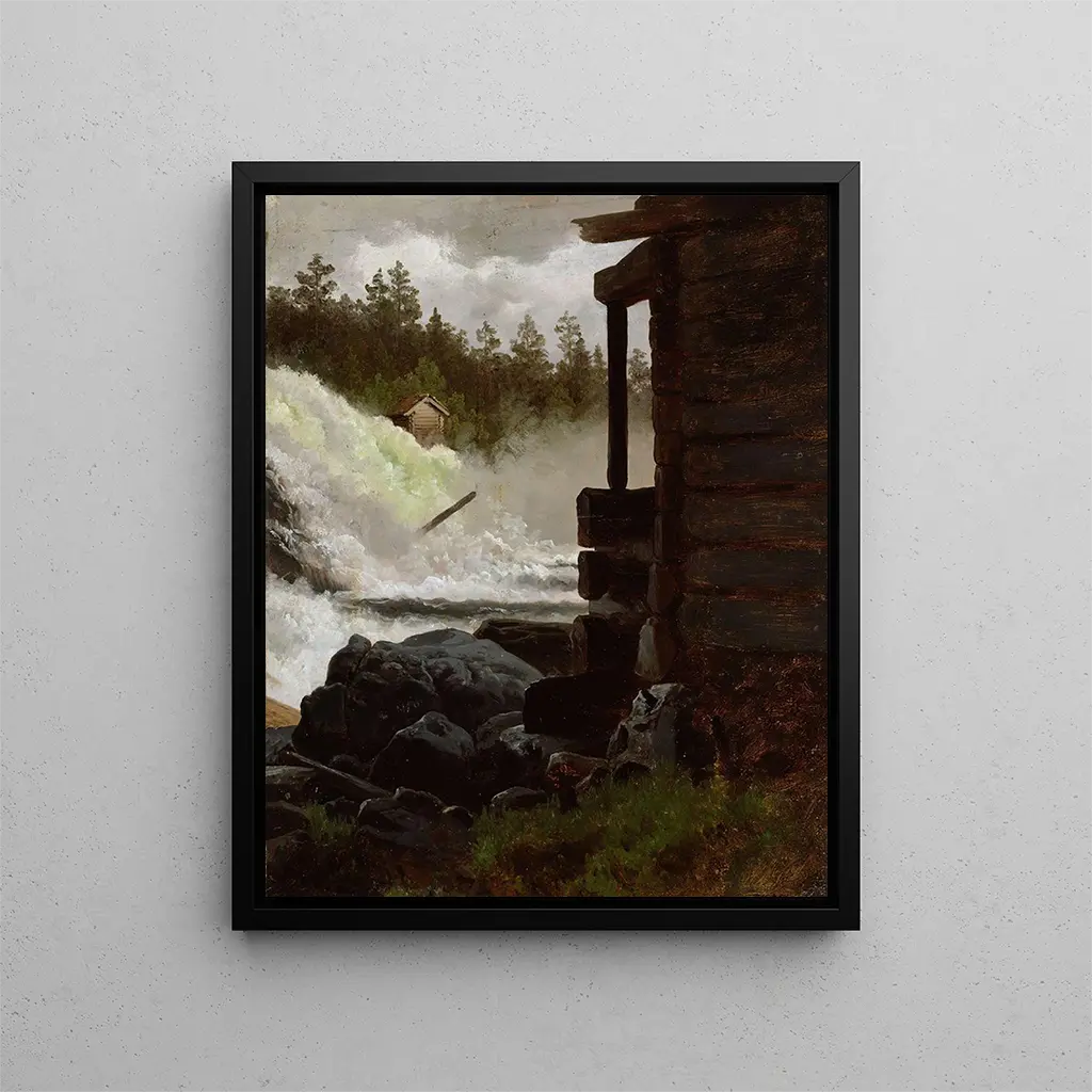 Tidemand's style is characterized by striking realism, where each element is treated with remarkable precision. The cascade, with its shades of blue and white, stands out against a background of lush greenery, creating a striking contrast that immediately catches the eye. The rocks, finely textured, add an almost tactile dimension to the piece, while the reflections in the water play with the light in a way that evokes the poetry of nature. Tidemand manages to capture not only the physical appearance of the landscape but also its spiritual essence, inviting the viewer to feel the quiet strength of nature. This painting, through its harmony and balance, stands out as a centerpiece of Nordic romanticism, where the artist expresses a deep connection with his environment.