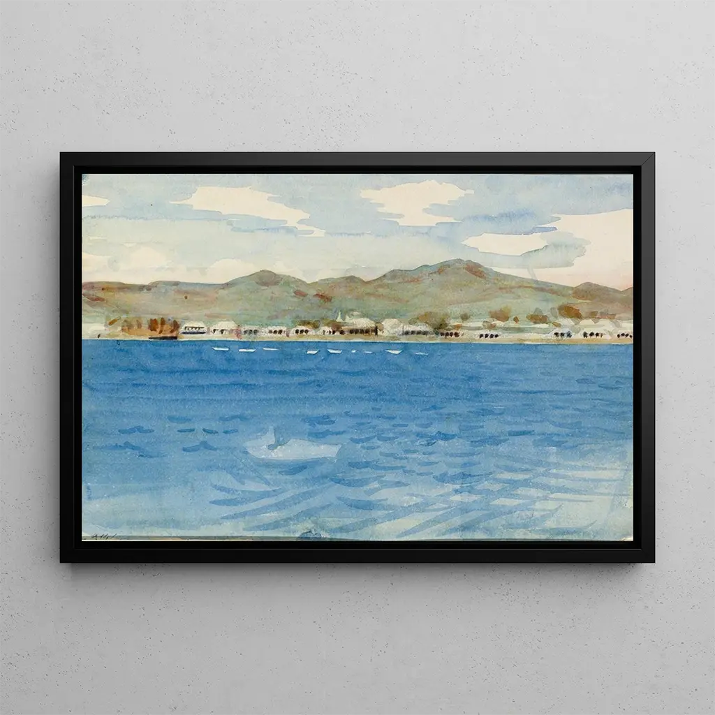 The art print Açores by Abbott Handerson Thayer transports us to the heart of an idyllic landscape, where nature flourishes in all its splendor. The vibrant shades of blue and green blend harmoniously, evoking the serenity of the skies and waters. The oil on canvas technique allows the artist to capture light in an almost magical way, creating a dreamlike atmosphere. The organic shapes of the hills and trees, as well as the delicacy of the clouds, invite deep contemplation, as if each brushstroke were a caress on the canvas.