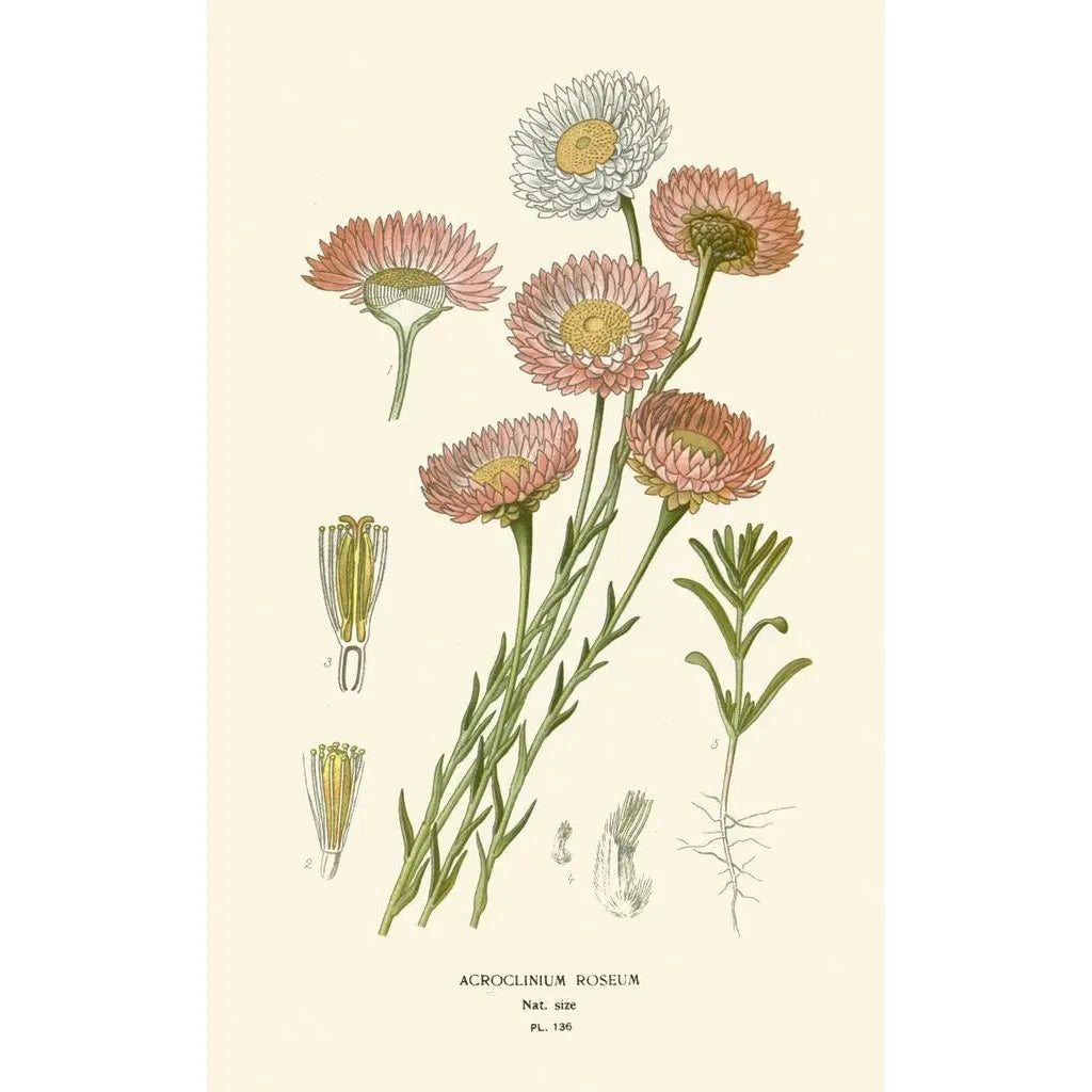 The art print of "Acroclinium roseum" is an ideal choice to enhance your living space, whether in a kitchen, living room, or office. Its print quality and fidelity to the original artwork guarantee a striking visual rendering. This piece, with its vivid colors and realistic depiction, brings a touch of freshness and vitality to your decor. By integrating this canvas into your interior, you create a warm and welcoming atmosphere while celebrating the beauty of nature. Its aesthetic appeal makes it an essential element for flower and art lovers.