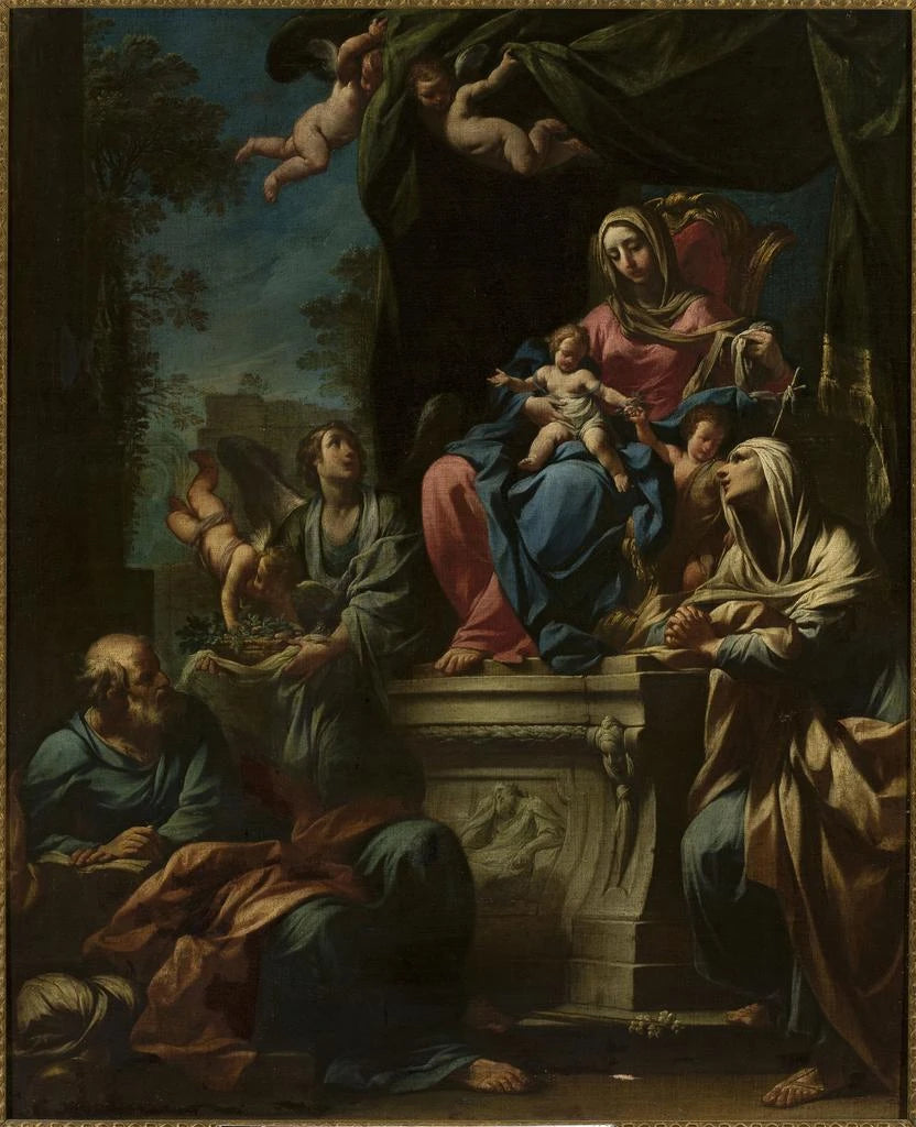 The Adoration of the Madonna is characterized by a baroque style, where light and shadow play a crucial role in the composition. Monti masters the art of chiaroscuro, emphasizing the features of the characters while creating a warm and enveloping ambiance. The drapery of the garments, sumptuously rendered, almost seems alive, adding a tactile dimension to the piece. The faces, full of emotion, reflect a humanity touched by the sacred. This blend of realism and spirituality makes this work a perfect example of the art of its time, where the depiction of faith combines with a refined aesthetic pursuit. The harmony of colors, ranging from pastel shades to deeper nuances, gives the scene a palpable serenity, inviting the viewer to fully immerse themselves.