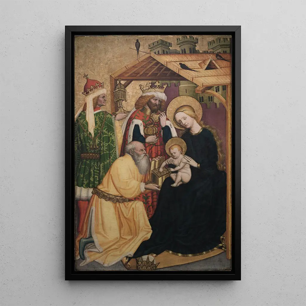 The art print of the Adoration of the Magi captures a moment of wonder and devotion. This vibrant artwork depicts the biblical scene where the Magi, guided by the star, come to offer their gifts to the Child Jesus. The rich colors and meticulous details of the Magi's costumes contrast with the gentle light emanating from the child. Each character is animated by an expression of respect and admiration, creating a warm and festive atmosphere. This canvas evokes not only a sacred story but also the spirit of generosity and sharing that characterizes the Christmas season.