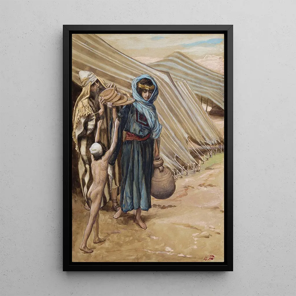 Dans cette œuvre émotive, James Tissot capture un instant délicat où Agar, la servante d'Abraham, se prépare à quitter son maître. La composition est marquée par des couleurs chaudes et terreuses, évoquant la chaleur du désert et la profondeur des émotions humaines. Les détails minutieux des vêtements et des expressions faciales créent une atmosphère empreinte de mélancolie et de tendresse. Tissot utilise une technique de peinture à l'huile qui permet de rendre la lumière et les ombres avec une grande précision, renforçant ainsi l'intensité de ce moment de séparation.