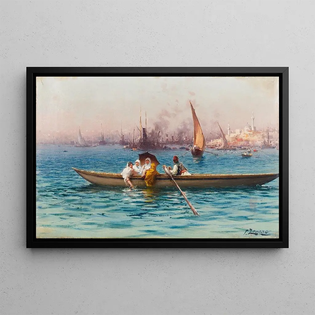 In this vibrant artwork, Fausto Zonaro immerses us in the heart of an animated maritime scene. The painting depicts joyful characters sailing on a caïque, a traditional boat. The vivid colors, ranging from the deep blues of the sea to the warm hues of the setting sun, create an atmosphere of happiness and freedom. Zonaro's impressionist technique, with its dynamic brushstrokes, brings each detail to life, making the movement of the waves and the laughter of the protagonists almost tangible. This art print of Amusement on the caïque invites a sensory escape, transporting the viewer to sunlit shores.