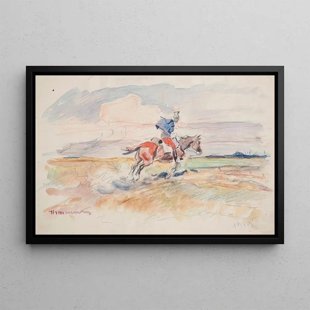 "Un Cavalier Autrichien sur un Cheval" by Ivan Ivanec captures a moment of bravery and nobility, where the rider, proud and majestic, stands tall on his steed. The meticulous details of the uniform and the dynamic posture of the horse testify to impressive technical mastery. The color palette, dominated by earthy tones and flashes of light, evokes the grandeur of Austrian landscapes. This art print transports the viewer to a glorious past, where heroism and elegance meet in a captivating visual dance.