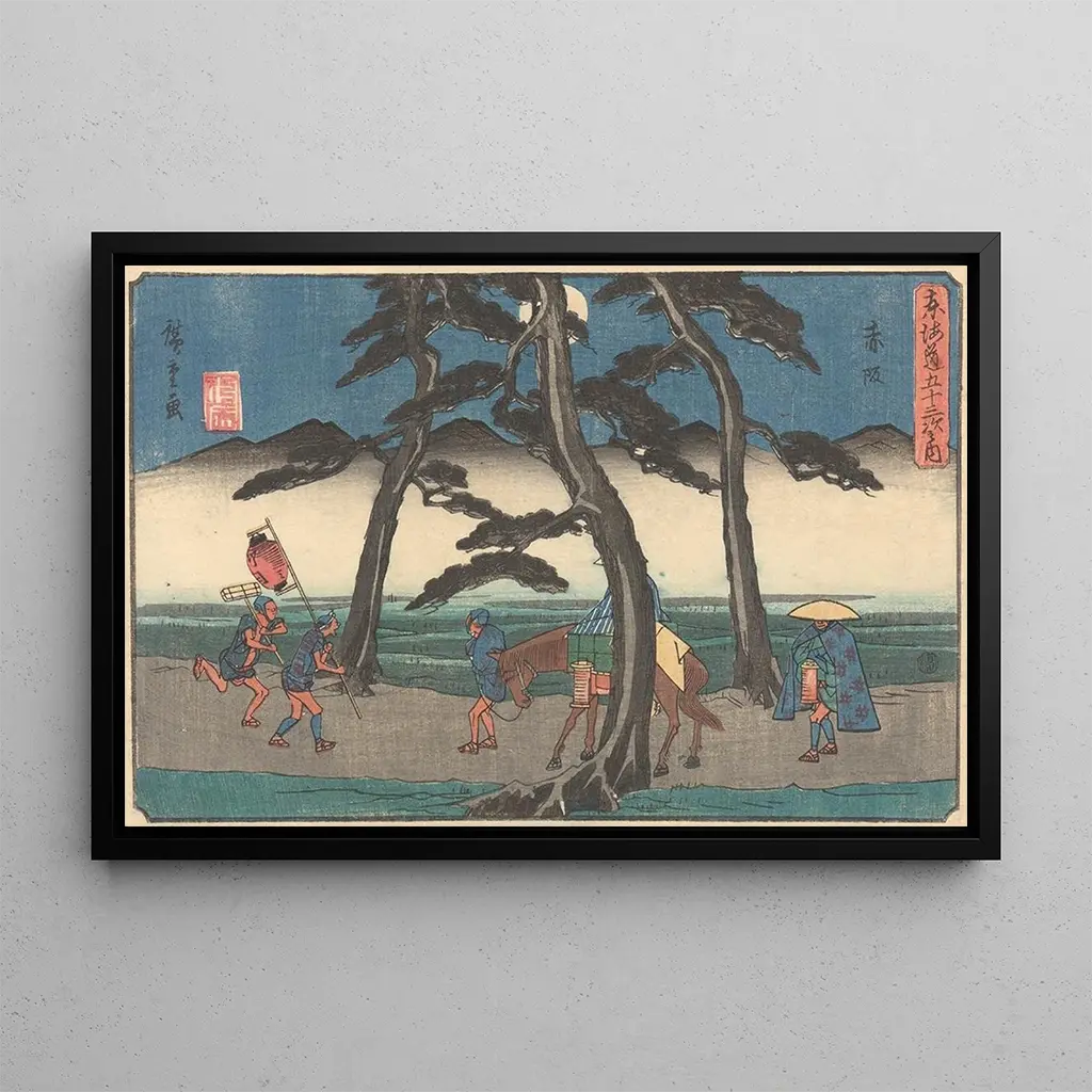 In the art print Akasaka, Andō Hiroshige captures the essence of a fleeting moment, where nature and urbanity meet. The vivid colors, ranging from lush greens to deep reds, create a lively and dynamic atmosphere. The woodblock print technique, typical of ukiyo-e, allows Hiroshige to play with textures and nuances, bringing each detail to life. The characters, in motion, seem almost to emerge from the canvas, inviting the viewer to immerse themselves in this lively scene, where everyday life blends with natural beauty.