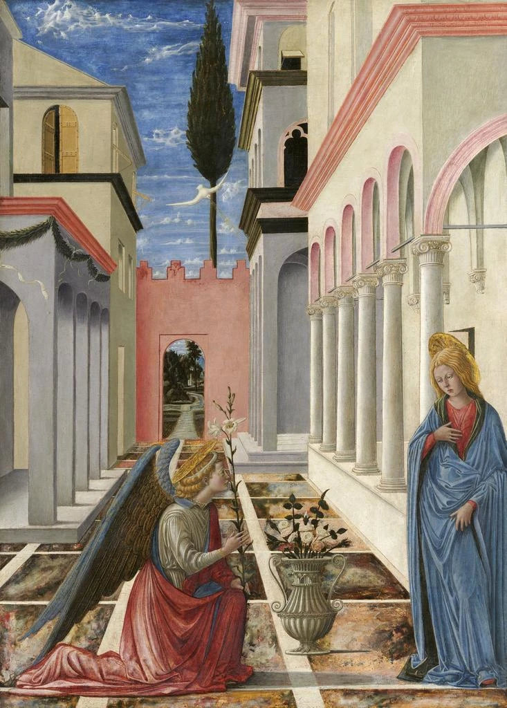 The Annunciation, an iconic art print by Fra Carnevale, captures the sacred moment when the archangel Gabriel announces to the Virgin Mary that she will conceive the Son of God. The composition is marked by delicate harmony, where pastel colors blend with touches of gold, creating an atmosphere that is both serene and mystical. The tempera on wood technique allows for remarkable detail, from the drapery of the garments to the expressions on the faces. Every element of this art print seems to vibrate with palpable spirituality, inviting the viewer to contemplate this decisive moment in Christian history.