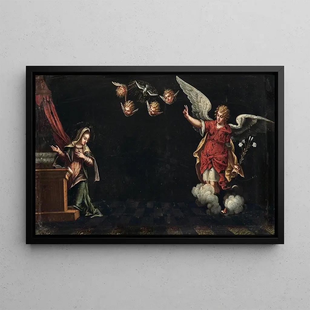 The Verona School, active during the Renaissance, is known for its unique style that blends Venetian and Lombard influences. Artists of this period, whose works are often marked by a quest for divine beauty, captured moments of grace and spirituality. Although little specific information is available about individual artists of this school, their contribution to religious art is undeniable. The Annunciation, through its delicate treatment and strong symbolism, perfectly illustrates the importance of this era in art history, where each art print tells a sacred story.