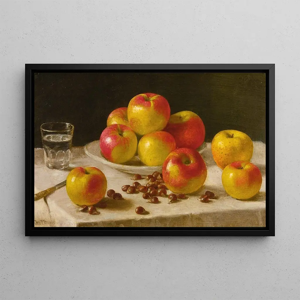 In this captivating artwork, Apples on a Table, John F. Francis immerses us in a universe where nature reveals itself in all its splendor. The apples, with their vibrant red hue, are carefully arranged on a wooden table, creating a striking contrast with the dark background. The subtly orchestrated lighting highlights the textures and reflections of the fruits, giving the scene a warm and inviting atmosphere. The artist's mastery of chiaroscuro enhances the depth of the piece, inviting the viewer to linger on every detail.