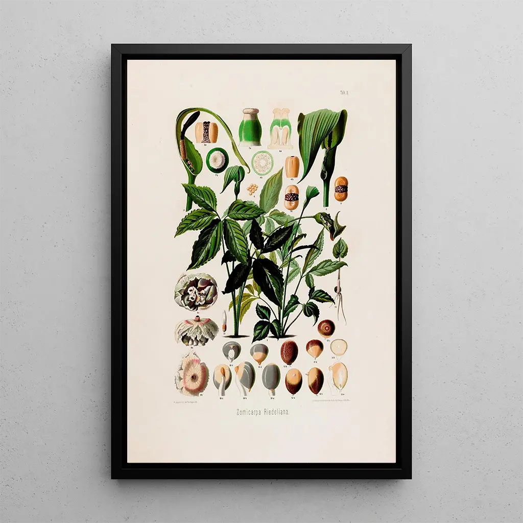 The art print Aroideae Maximilianae Pl03 offers a captivating immersion into the world of exotic plants. This piece stands out with its meticulous details and vibrant colors, evoking the richness and diversity of tropical flora. Shades of green, violet, and blue blend harmoniously, creating a visually striking composition. The artist, through their delicate technique, succeeds in conveying the vitality and beauty of each element, making this work a true invitation to explore nature. Each leaf seems to vibrate with life, transporting the viewer to a lush garden.