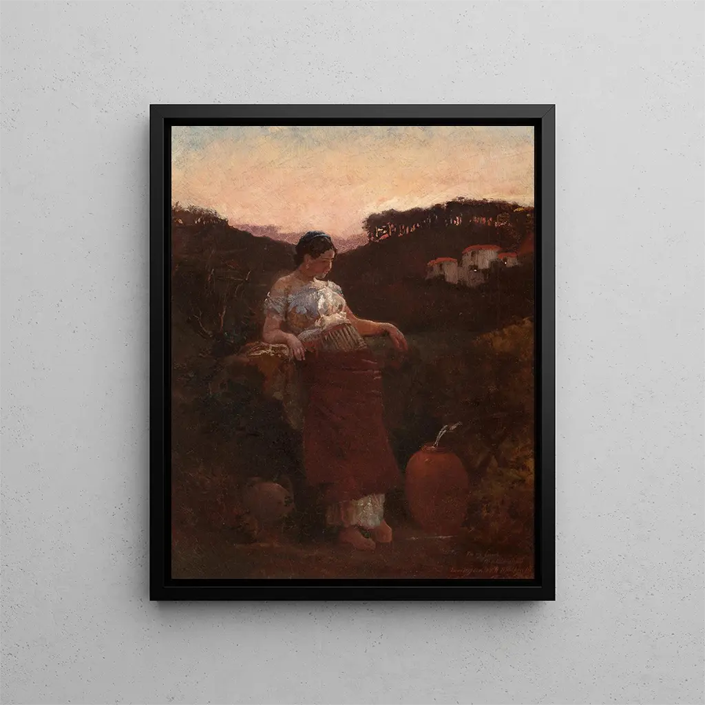 Art print Au puits - Edwin Howland Blashfield – Engaging Introduction In the vast panorama of art history, certain works stand out for their ability to capture a moment, an emotion, or an atmosphere. "Au puits" by Edwin Howland Blashfield is one of those creations that transports the viewer into a world filled with serenity and contemplation. This painting evokes not only a moment from everyday life but also embodies an aesthetic that transcends time. Through the depiction of a woman at the well, Blashfield invites us to reflect on the simplicity of daily gestures and their intrinsic beauty. Style and uniqueness of the work Blashfield's style is characterized by meticulous attention to detail and a subtle use of light. In "Au puits," soft colors and delicate nuances create a calming, almost dreamlike atmosphere. The composition is carefully balanced, highlighting the female figure while harmoniously integrating the surrounding elements. The water in the well, a symbol of life and renewal, plays a central role in this work, while the landscape around it evokes a generous and welcoming nature. This painting is not limited to a simple representation; it tells a story, that of a woman interacting with her environment, thus emphasizing the harmony between man and nature. The artist and his influence Edwin Howland Blashfield, born in 1848, was an artist whose work was deeply influenced by the Pre-Raphaelite movement and American realism. His career, marked by an incessant search for beauty and truth, reflects a desire to elevate the everyday to a level of visual poetry. Blashfield established himself as a master of frescoes, but it is in his paintings that his talent for capturing moments of grace is truly evident. His influence extends beyond his own creations, inspiring many contemporary artists to explore the relationship between man and his environment. "Au puits" is a perfect illustration of this quest, where each brushstroke seems to resonate with a profound understanding of the human condition. An exceptional wall decoration signed Artem Legrand In the context of interior decoration, the work