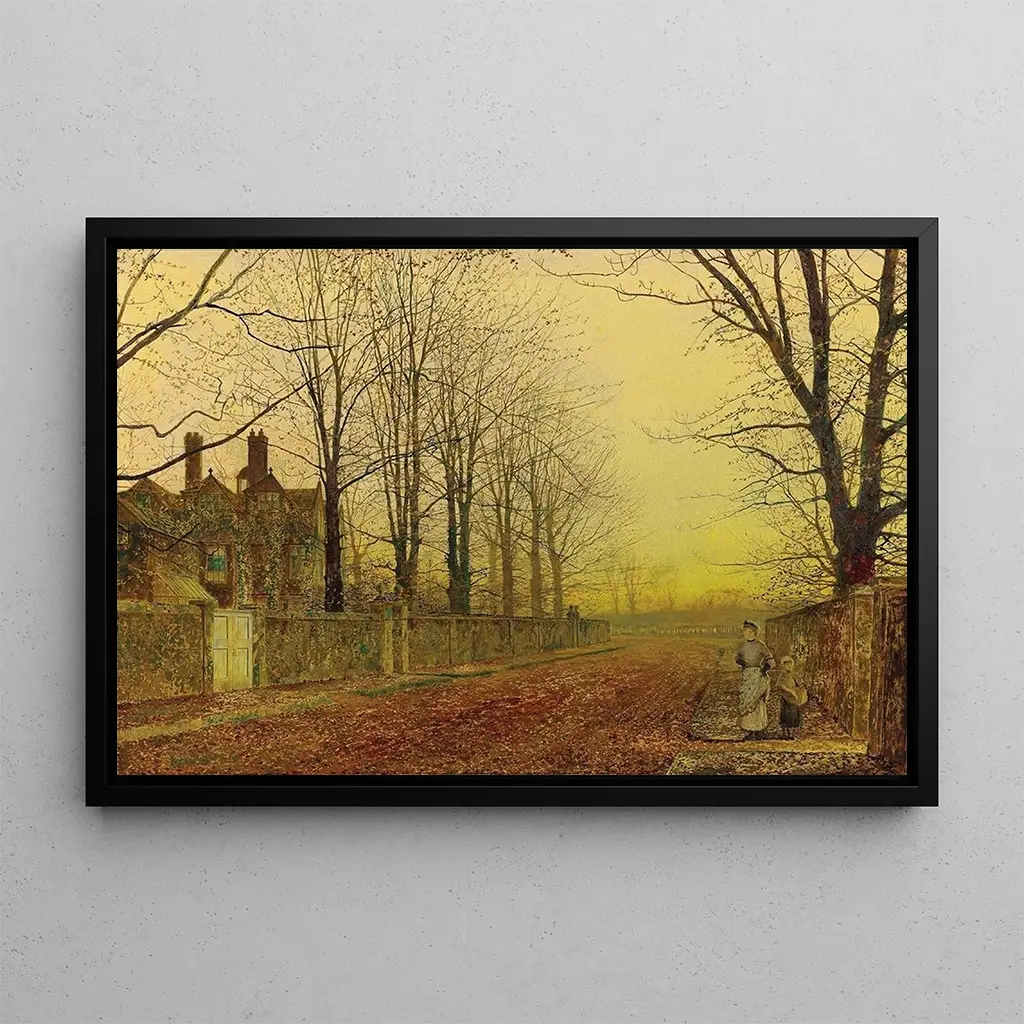 The art print Gloire d'automne by John Atkinson Grimshaw transports us to an autumn landscape filled with melancholy and beauty. The golden and orange hues of the leaves, illuminated by a soft light, create an almost magical atmosphere. Grimshaw, master of chiaroscuro, uses striking contrasts to highlight the depth and texture of nature. The meticulous details of the trees and paths evoke a sense of calm and serenity, while the sky, tinged with pastel shades, adds a poetic dimension to this scene. This artwork is a true celebration of the season, capturing the ephemeral beauty of autumn.
