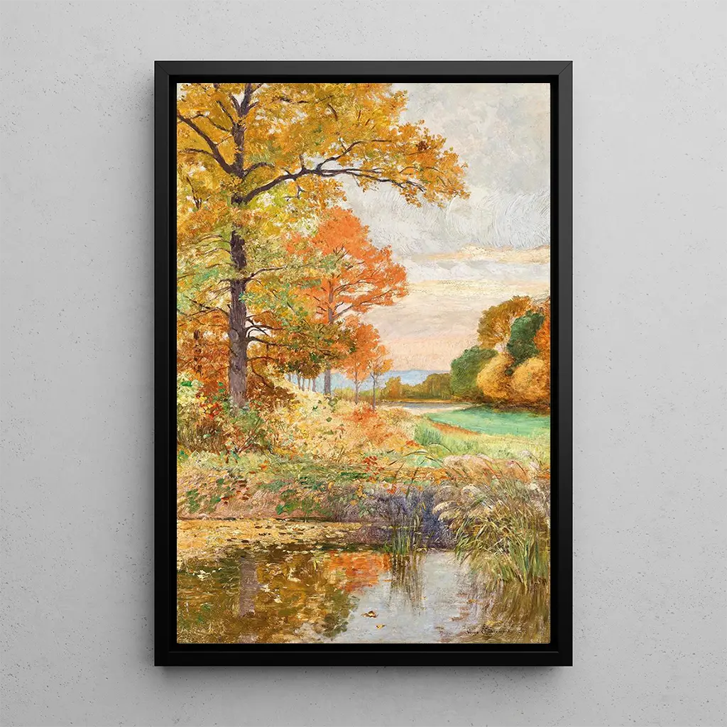 A Autumn Landscape: An Ode to Nature in Full Transformation In this captivating art print, "A Autumn Landscape," Hugo Charlemont transports us to the heart of vibrant nature, where warm autumn hues blend harmoniously. The trees, dressed in golden and orange leaves, stand majestically, while a cloudy sky adds a dramatic depth to the scene. Charlemont's technique, skillfully combining realism with an impressionist touch, creates an atmosphere that is both serene and melancholic. Every brushstroke seems to capture the breath of the wind and the whisper of the leaves, inviting the viewer to immerse themselves in this fleeting beauty. Hugo Charlemont: a master of landscape art at the turn of the 20th century Hugo Charlemont, a French painter of the 19th century, is renowned for his evocative landscapes that reflect a deep connection with nature. Influenced by the Impressionist movement, Charlemont developed a unique style, blending precision and emotion. His career was marked by a constant exploration of light and color variations, especially in his representations of the seasons. "A Autumn Landscape" fits within this tradition, demonstrating his skill in capturing the fleeting beauty of nature. His work continues to inspire art enthusiasts, making him an essential figure of his era. A decorative art print with multiple virtues Choosing the reproduction of "A Autumn Landscape" for your interior means selecting a piece that evokes tranquility and the beauty of nature. Whether in a living room, office, or bedroom, this art print adds a warm and soothing touch to your decor. The quality of the reproduction guarantees perfect fidelity to the colors and details of the original artwork, while offering undeniable aesthetic appeal. By adding this canvas to your space, you invite not only the beauty of autumn into your home but also a work of art that inspires contemplation and escape.