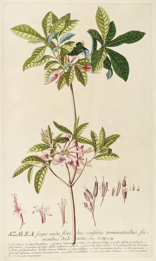 Georg Dionysius Ehret, active in the 18th century, is recognized as one of the greatest botanical illustrators of his time. Influenced by the baroque movement and the scientific discoveries of his era, he mastered the blend of art and science, creating works that are both aesthetic and informative. His passion for botany led him to travel across Europe, where he collected specimens and studied plants in their natural habitat. "Azalée" testifies to his unique talent and his commitment to faithful representation of flora, making him a key figure in the history of botanical art.