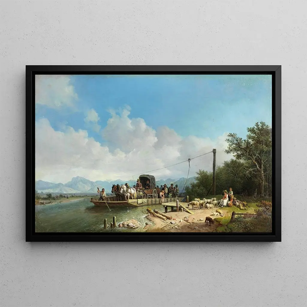 Bac sur l'Inn: a lively scene of everyday life. Heinrich Bürkel offers us with "Bac sur l'Inn" a vibrant depiction of a typical river activity. The warm, earthy colors, combined with touches of blue, evoke a lively and convivial atmosphere. The dynamic composition, centered on the ferry and its passengers, captures the movement and energy of the scene. Bürkel uses an oil painting technique that brings life to the characters and the details of the surrounding landscape. This artwork invites you to immerse yourself in the daily life of the 19th century, where rivers were vital arteries for commerce and exchanges. Heinrich Bürkel: a witness of his time. German artist of the 19th century, Heinrich Bürkel is known for his genre scenes and landscapes. Influenced by Romanticism, he is interested in daily life and human interactions, capturing moments of simplicity and beauty. His career is marked by a meticulous attention to detail and a capacity to convey emotions through his works. "Bac sur l'Inn" perfectly illustrates his style, blending realism and sensitivity. Through his paintings, Bürkel invites us to rediscover a world where nature and man coexist in harmony, while also bearing witness to the importance of navigable waterways in his society. A decorative acquisition with multiple assets. The art print of "Bac sur l'Inn" is a perfect choice to enhance your interior decor, whether in a living space, an office, or a dining room. Its printing quality ensures remarkable fidelity to the colors and details of the original work, adding an authentic touch to your decor. With its lively and warm atmosphere, this painting creates a welcoming and dynamic ambiance. By integrating this canvas into your space, you offer your guests an invitation to discovery and exchange, while adding an art piece that sparks interest and conversation.