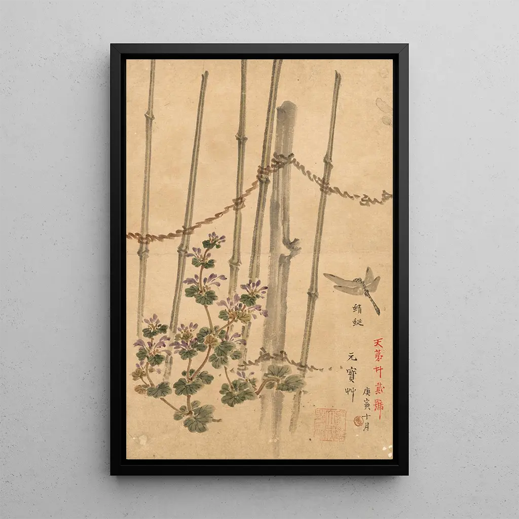 The art print Clôture en bambou et chrysanthèmes depicts a scene filled with serenity and balance. The vibrant colors of the chrysanthemums contrast delicately with the natural tones of the bamboo, creating a visually captivating composition. The painting technique, refined and precise, highlights the details of the flowers and the texture of the bamboo, inviting the viewer to appreciate the beauty of nature. This artwork evokes a sense of peace and tranquility, transporting the observer to a lush garden, a symbol of the ephemeral beauty of life.