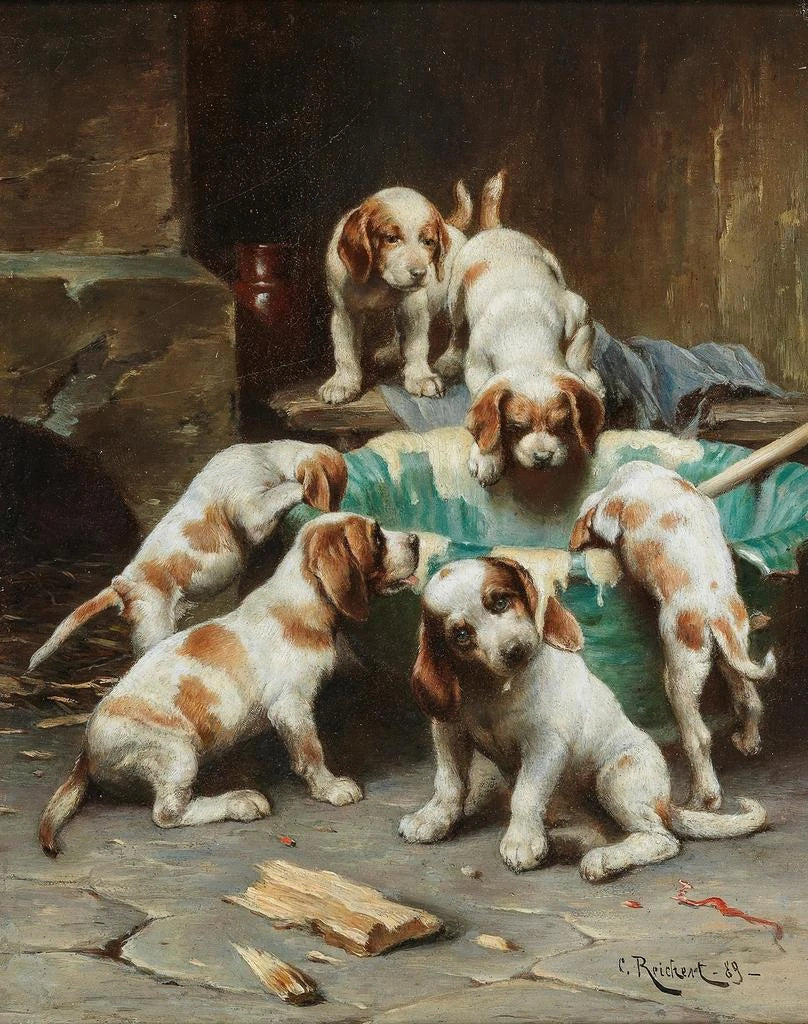 Art print of Beagle puppies enjoying a treat - Carl Reichert – Captivating introduction In the vibrant world of animal art, the work "Beagle puppies enjoying a treat" by Carl Reichert stands out for its irresistible charm and striking realism. This painting, which captures the innocence and joy of puppies, invites the viewer to immerse themselves in a moment of tenderness and lightheartedness. The animals, often symbols of loyalty and affection, are depicted here in a daily scene that evokes the bond between humans and their best friends. The soft light bathing the canvas enhances the warmth of this interaction, making this piece a true homage to nature and domestic life. Style and uniqueness of the work Carl Reichert, master of detail and movement, manages to infuse an incredible life into his subjects. In "Beagle puppies enjoying a treat," every hair of the animals is meticulously painted, revealing an almost tangible texture. The composition is carefully balanced, with the puppies intertwining in a dance of curiosity and play, while the colors, both vivid and harmonious, reinforce the joyful atmosphere of the scene. This realism, characteristic of Reichert's style, goes far beyond simple representation: it evokes emotion, childhood memories, a nostalgia for simple yet precious moments. The way he captures the instant, with particular attention to the expressions of the puppies, testifies to his exceptional talent as an artist. The artist and his influence Carl Reichert, born in 1836 in Vienna, established himself as one of the most appreciated animal painters of his time. His classical training and interest in nature shaped his unique style, combining technical precision with artistic sensitivity. Influenced by the great masters of animal art, he developed a personal approach that allowed him to stand out. His works, often imbued with melancholy and tenderness, reflect a deep understanding of animal psychology. Reichert also contributed to popularizing the portrait of domestic animals, paying tribute to their place in the hearts of families. His legacy endures in