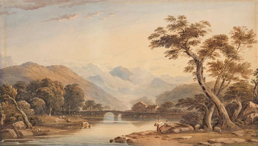 John Varley, active in the early 19th century, is recognized as one of the forerunners of Romantic landscape art in Great Britain. Influenced by nature and the great masters of landscape painting, he captured the beauty of British scenery with a unique sensitivity. Varley also played an important role in teaching watercolor techniques, inspiring many artists of his time. The Pont de Beddgelert, created in a context where nature was celebrated, demonstrates his talent for depicting scenes of rural life while highlighting the majesty of the mountains.