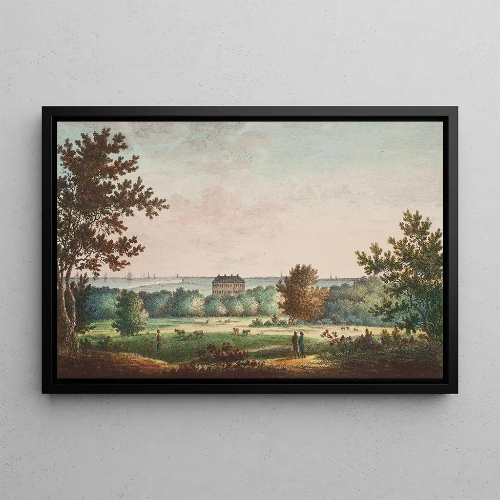 The art print of Elias Meyer's work, "Bernstorff from Fortunen," transports us to an idyllic landscape where nature and architecture meet harmoniously. The soft shades of green and blue, combined with touches of golden light, create a serene and calming atmosphere. Meyer, with his delicate style, manages to capture the beauty of gardens and buildings while conveying a sense of tranquility. This canvas evokes a moment of contemplation, where one can almost hear the whisper of the wind in the trees and the singing of birds.