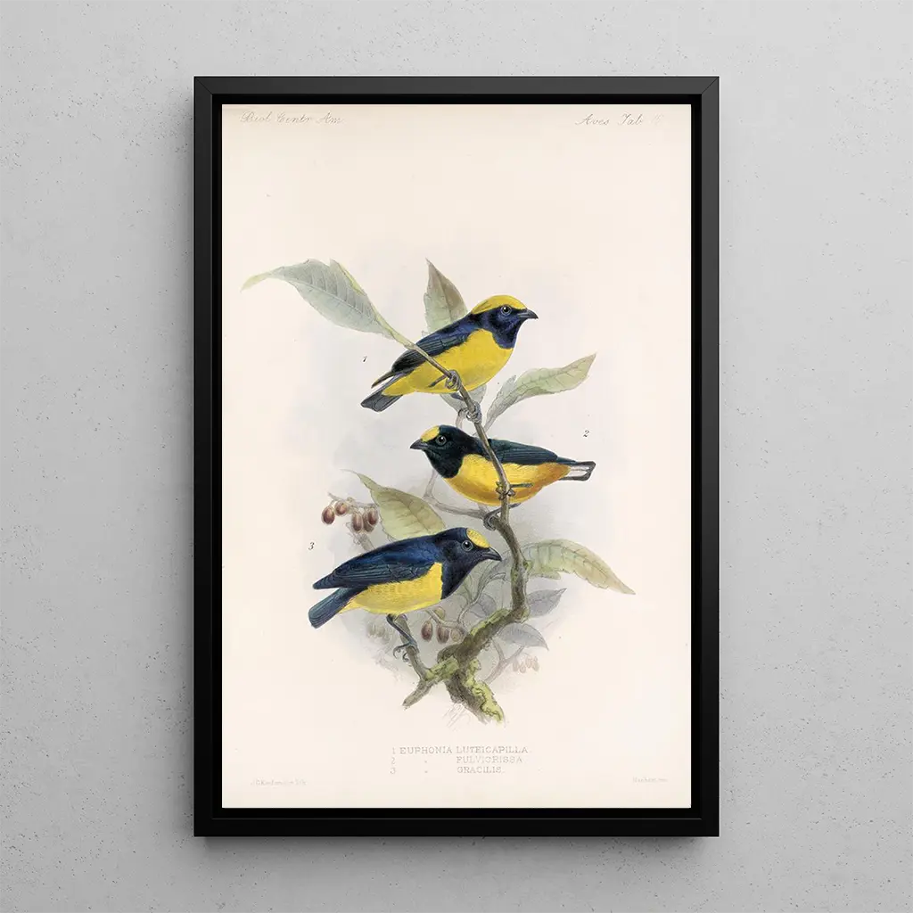 The art print "Aves Pl 17" by Frederick DuCane Godman is a captivating representation of ornithological beauty. This piece, rich in detail, captures the essence of several bird species, highlighting their vibrant plumage and graceful postures. The vivid colors, ranging from deep reds to bright yellows, intertwine harmoniously, creating a lively and dynamic atmosphere. The watercolor technique, skillfully applied, conveys the lightness of feathers and the delicacy of forms. This art print invites attentive contemplation, revealing the meticulous work of the artist and the wonder inspired by nature.