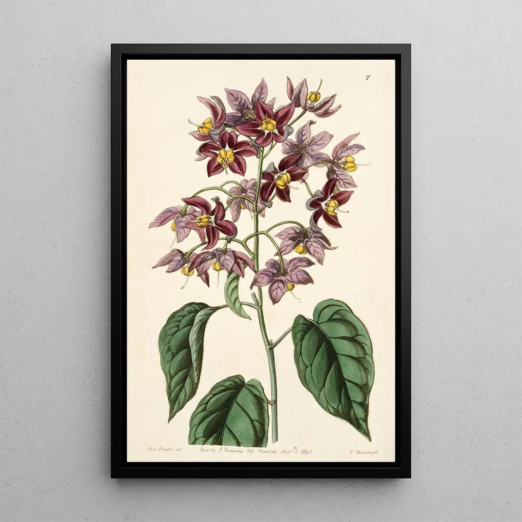 Douce-amère à grandes anthères : an art print journey into the heart of flora The art print Douce-amère à grandes anthères transports us into a world where nature flourishes with grace. The vibrant colors of the flowers, combined with delicate details, evoke a sense of lightness and freshness. The watercolor technique, mastered by Sydenham Edwards, captures the transparency of the petals and the depth of the shadows. This piece, both poetic and scientific, invites attentive contemplation of the wonders of nature, revealing the hidden beauty of plants. Sydenham Edwards : an artist dedicated to science Sydenham Edwards, a botanical illustrator of the early 19th century, made his mark by creating works that blend art and science. His artistic training, coupled with a passion for botany, enabled him to produce illustrations of exceptional precision. Edwards was influenced by the scientific advances of his time, which allowed him to rigorously document the diversity of plant species. His works, often published in specialized books, contributed to the growth of botanical illustration, making him a prominent figure in this field. A decorative acquisition with multiple advantages The art print Douce-amère à grandes anthères is a perfect choice to enhance your interior. Whether in a living room, office, or bedroom, this canvas adds a touch of color and vitality. Its printing quality ensures fidelity to the details and colors of the original artwork, while offering undeniable visual appeal. By incorporating this piece into your decor, you create a welcoming and inspiring space, while paying tribute to the beauty of nature.