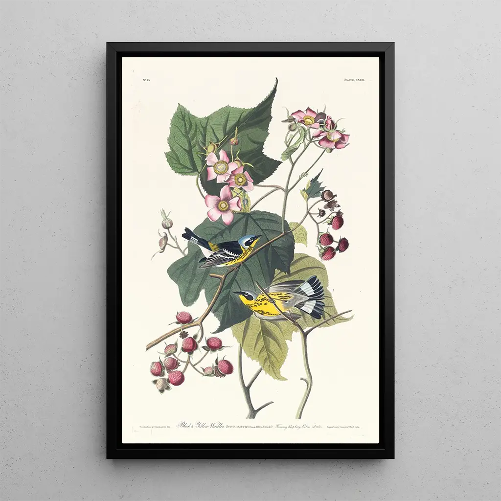 The art print of the Black and Yellow Warbler captures the vibrant essence of nature through a palette of striking colors. The shades of yellow and black blend harmoniously, creating a captivating contrast that immediately draws the eye. Audubon's technique, which combines scientific precision with artistic sensitivity, brings this bird to life in a richly detailed natural environment. Each feather is rendered with care, and the background, often lush, evokes an atmosphere of serenity and wild beauty. This piece invites a deep contemplation of avian wildlife, revealing the delicacy and complexity of wild life.